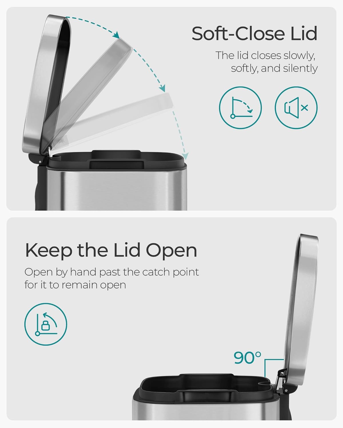 - [Soft-Close, Odor-Sealing Lid] This kitchen trash can features a slow and quiet soft close lid. The tight seal of the lid prevents lingering odors