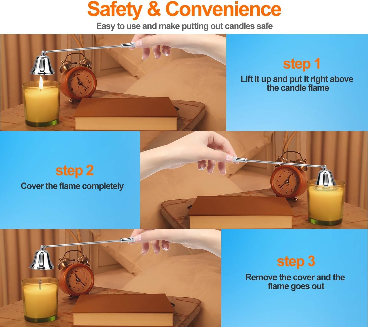 - EASY TO USE:No more blowing out candles. Just need to hold the candle stopper and lower the bell over the flame, the flame is extinguished immediately. Makes putting out candles safer than blowing it directly.