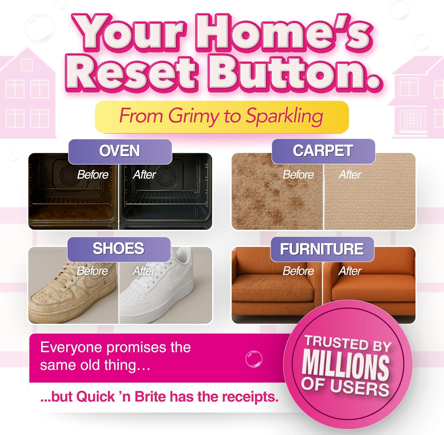 - ULTIMATE ALL-PURPOSE CLEANER – Quick ’n Brite replaces multiple household cleaners, tackling tough stains, grease, and grime on carpets, ovens, BBQs, kitchens, shoes, and more.