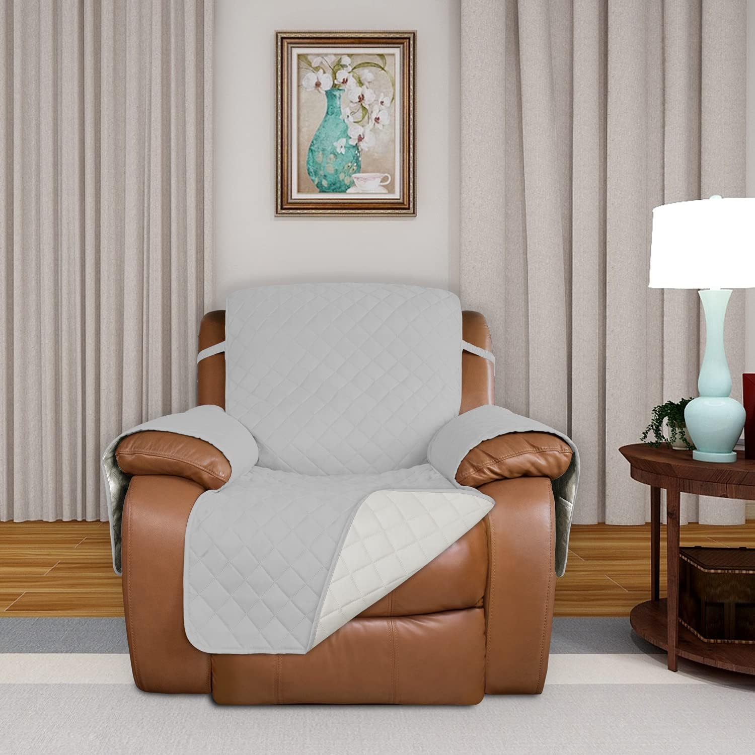 PureFit Reversible Quilted Sofa Cover, Water Resistant Slipcover Furniture Protector, Washable Couch Cover with Non Slip and Elastic Straps for Kids, Dogs (Oversized Recliner, Light Gray/Ivory)