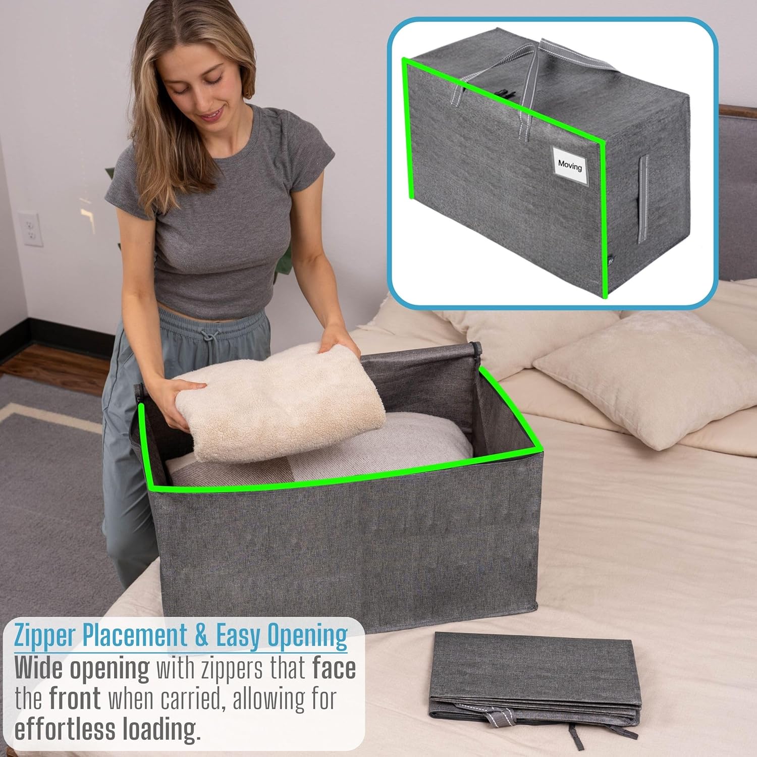- Moving Box Alternative: A lightweight, economical, convenient alternative to moving boxes, bins, or containers. No additional packing supplies required; simply unfold, unzip, and start packing.These reusable bags collapse easily, stack neatly, and fold flat into a compact size for effortless storage in your drawer, closet, car, or luggage. Additionally, they are easy to clean with a damp cloth or wipe, ensuring hassle-free maintenance between uses.