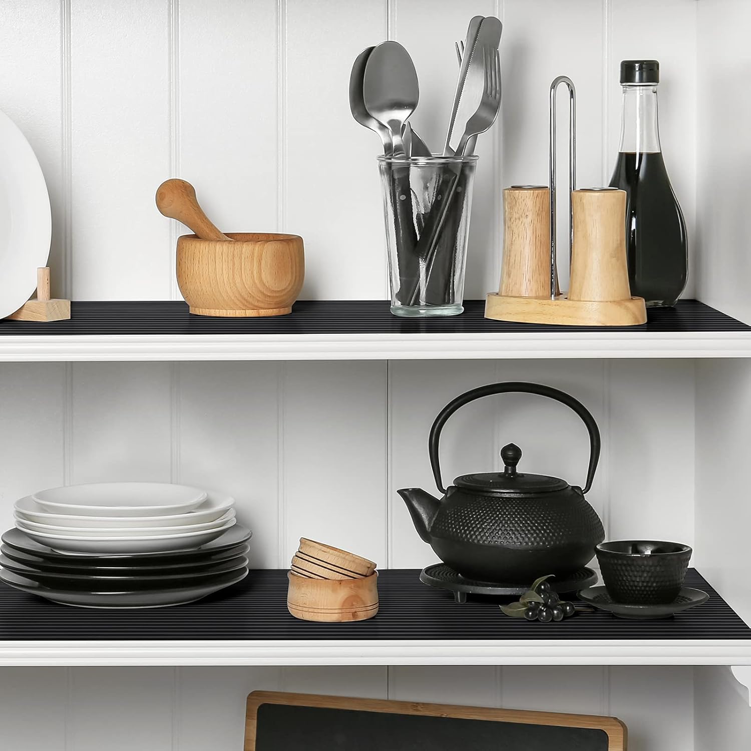 Black Shelf Liners for Kitchen Cabinets Non-Adhesive, Drawer Mat Liner for Bathroom, Plastic Pantry Shelf Liner Waterproof Washable Cabinet Protector Liners for Shelves, Cupboard Liner