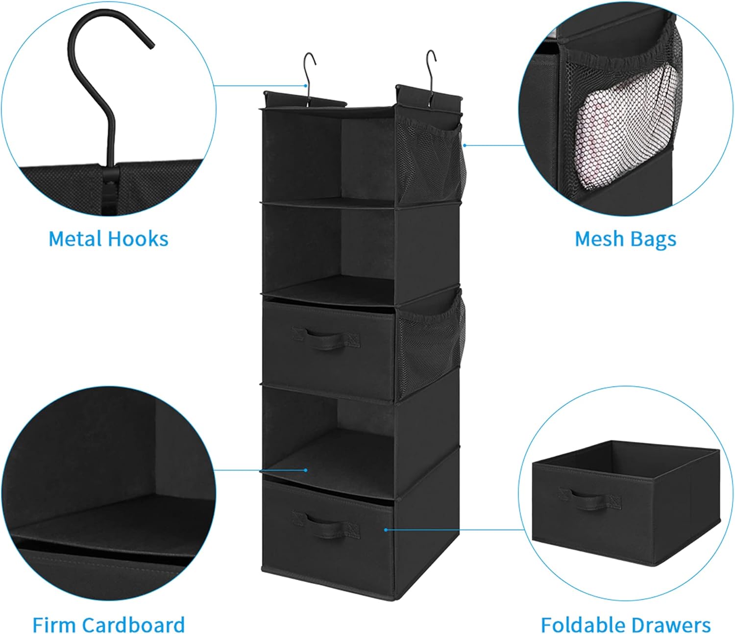 MAX Houser 5 Tier Shelf Hanging Closet Organizer, Cloth Hanging Shelf with 2 Sturdy Hooks for Storage, Foldable (Black-D2)