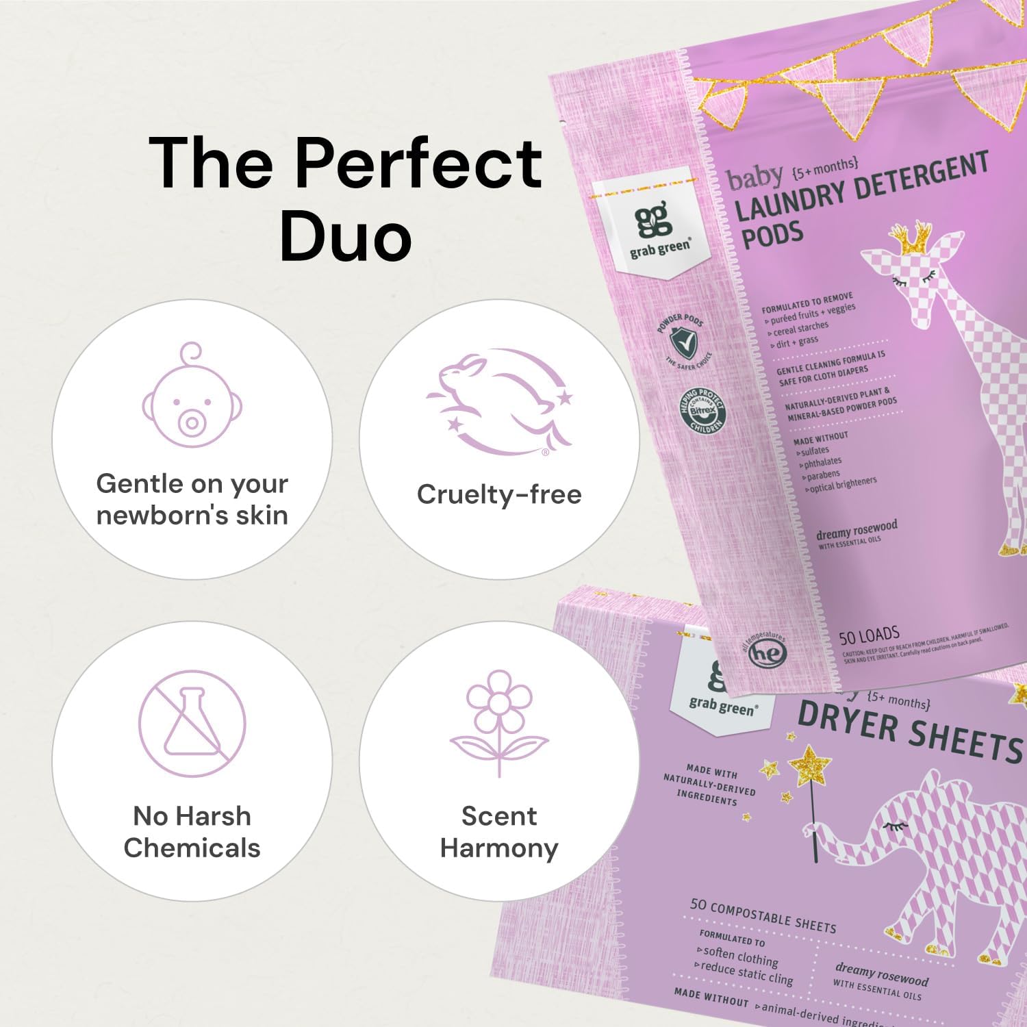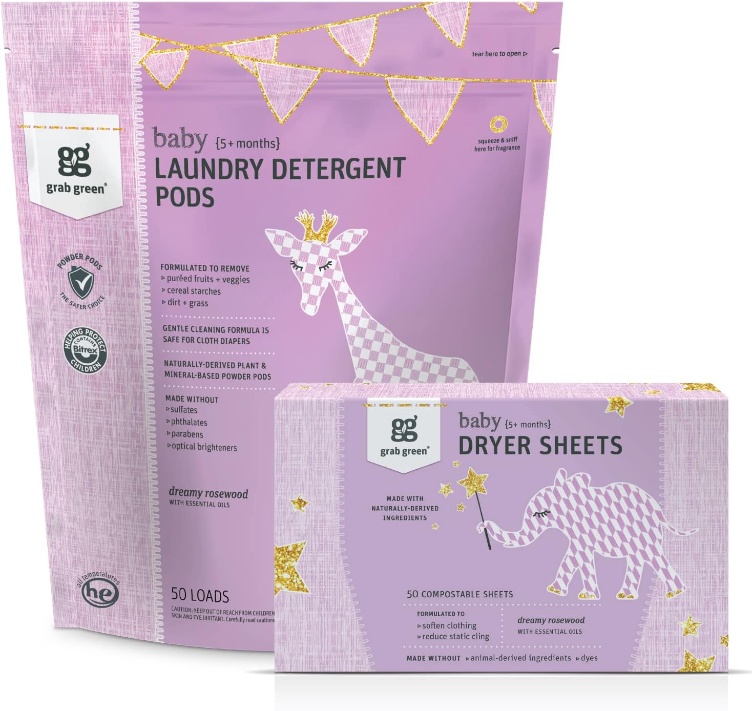 - Contains: 1- 50 Pod Bag of Grab Green Natural Dreamy Rosewood Baby Laundry Detergent Pods and 1- 80 Sheet Box of Grab Green Natural, Compostable Dreamy Rosewood Newborn Baby Dryer Sheets