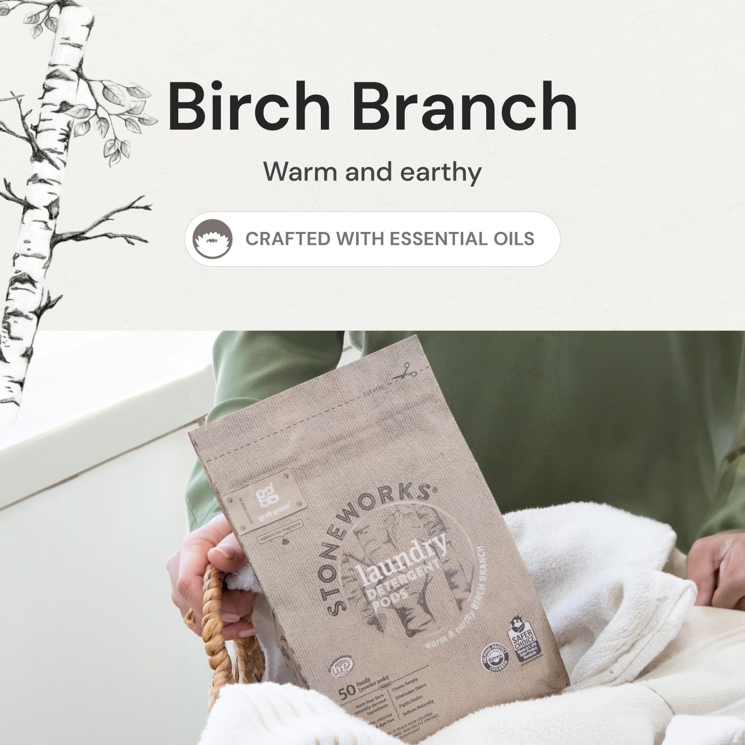 - Birch Branch: Perfectly paired, our convenient, pre-measured pods and compostable dryer sheets provide a warm and earthy natural fragrance