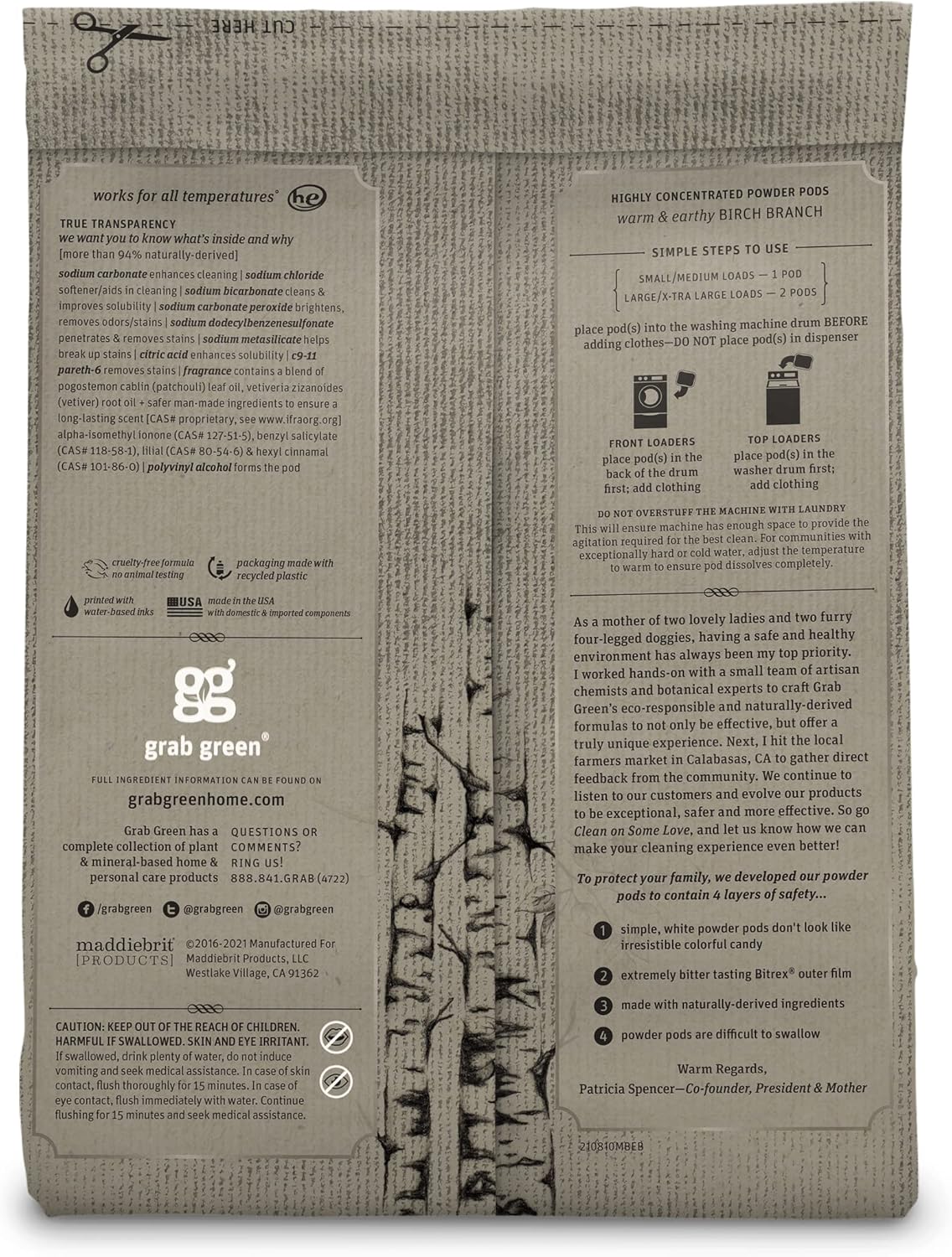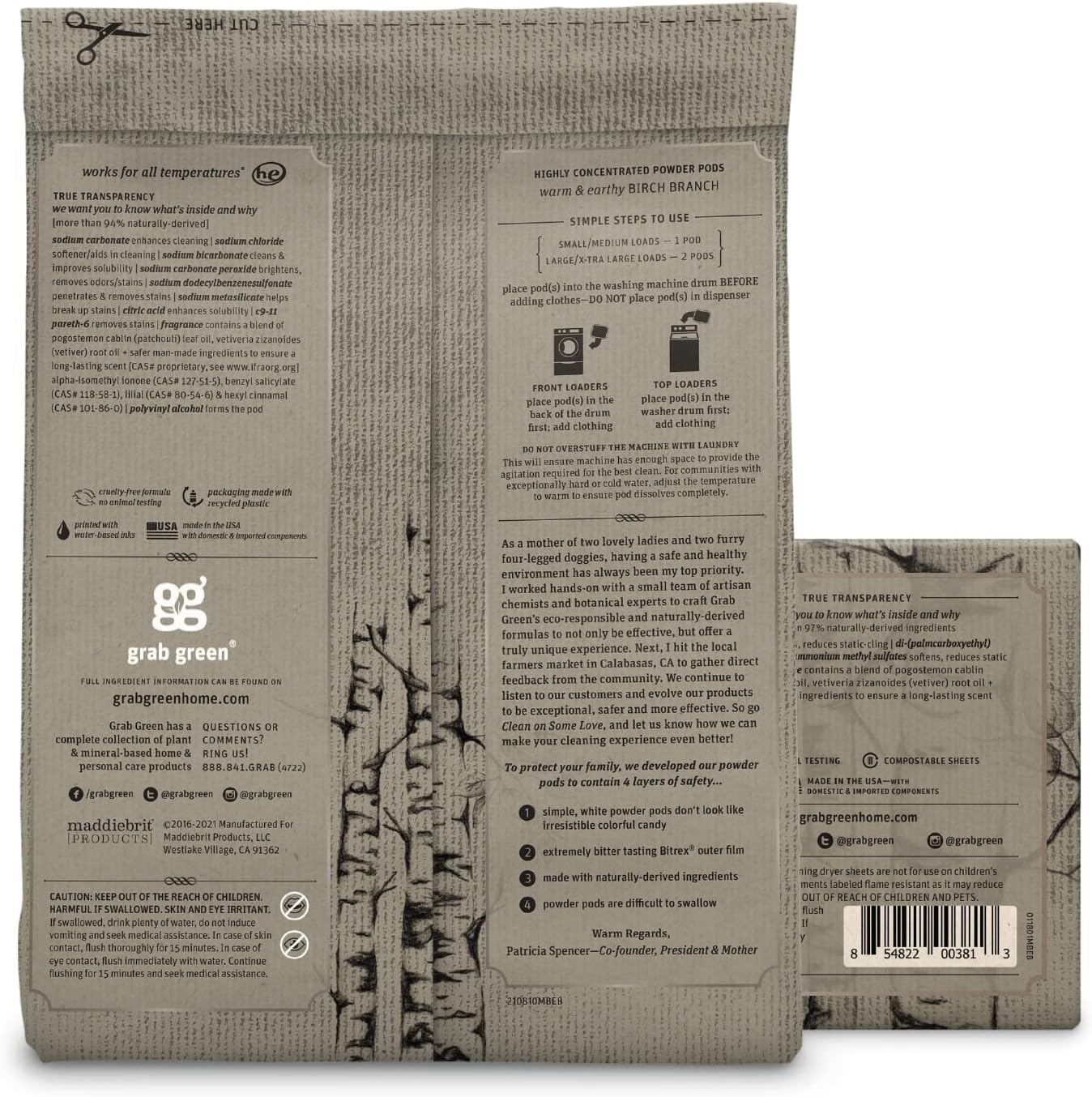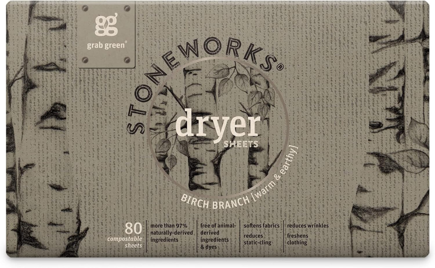 - Contains: 1- 50 Pod Bag of Grab Green Stoneworks Birch Branch Laundry Detergent Pods and 1- 80 Sheet Box of Grab Green Stoneworks Natural, Compostable Birch Branch Dryer Sheets