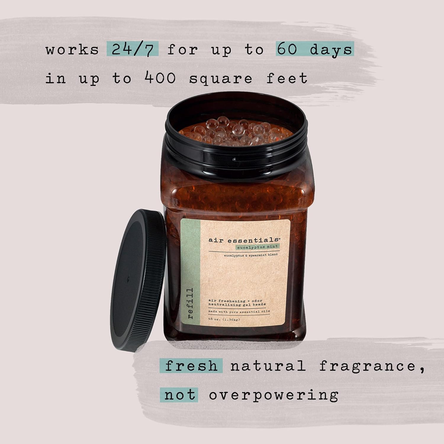 - MADE WITH PURE ESSENTIAL OILS - Air Essentials Air Freshening & Odor Neutralizing Gel Bead Refill contains only plant derived ingredients and a blend of pure essential oils. Each jar provides a pleasant fragrance that does not overwhelm the senses. The Gel Beads will work 24/7 for up to 60 days in up to 400 square feet.