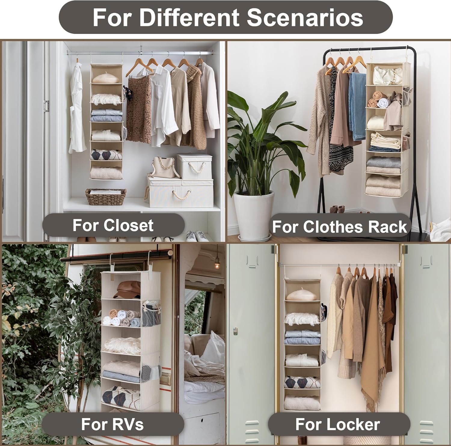 StorageWorks 6-Shelf Hanging Closet Organizer, Hanging Shelves for Closet, Fabric, Mixing of Beige, White & Ivory, 12" D x 12" W x 47 1⁄2" H