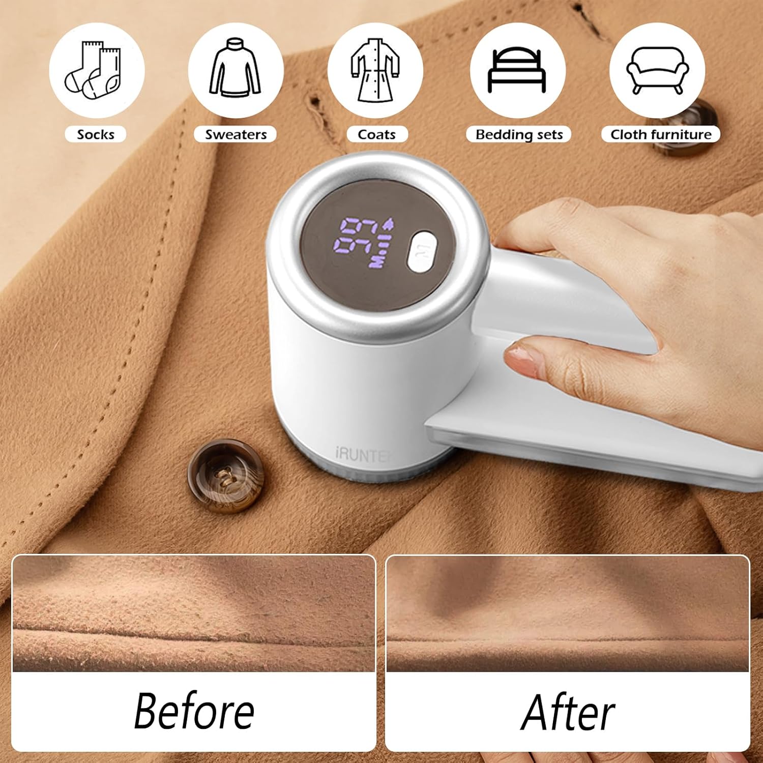 iRUNTEK Rechargeable Fabric Shaver, Electric Commercial Lint Remover with LED Display & Big Trash Box, 3-Speeds for Removing Fuzz and Pill from Clothes, Furniture, Sweater, Couch and Blanket, Silver