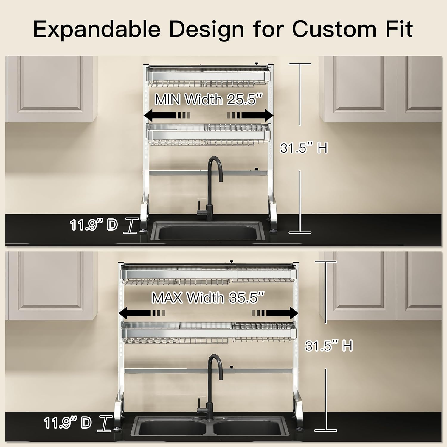 - 🔄 Expandable Design for Custom Fit: Adjust the over sink dish drying rack width effortlessly to span most standard single or double sinks, adapting seamlessly to your kitchen layout. The dish drain modular design allows rearranging tiers and accessories to prioritize space for tall glasses, wide pans, or cleaning tools, maximizing vertical storage above the sink