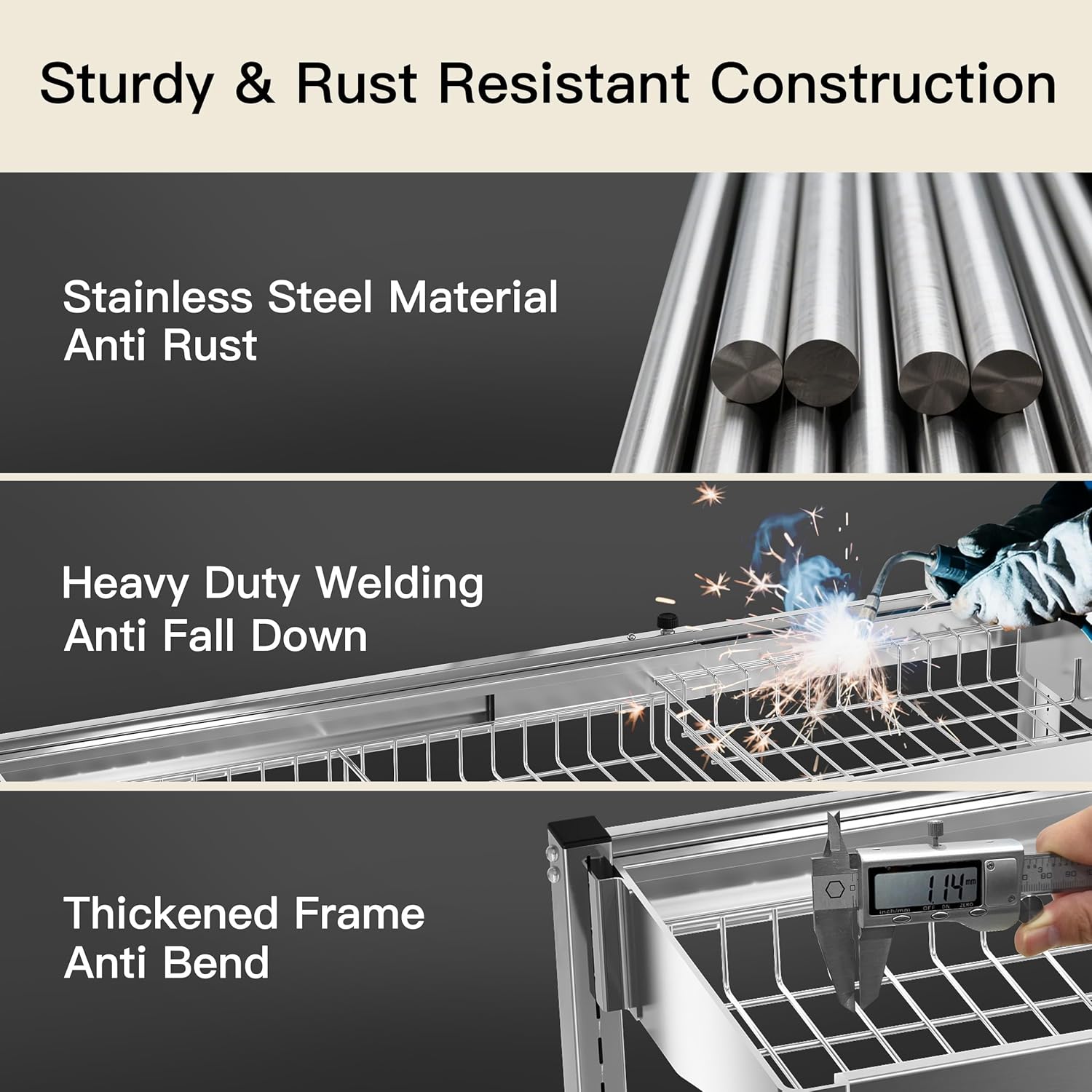 - 🔩 Sturdy & Rust Resistant Construction: Crafted with heavy duty stainless steel and reinforced welding, this over the sink dish drainer drying rack resists corrosion and daily wear. Its industrial grade framework securely holds bulky pots, pans, and dishware without sagging, even when fully loaded, ideal for families seeking a lasting solution to countertop clutter
