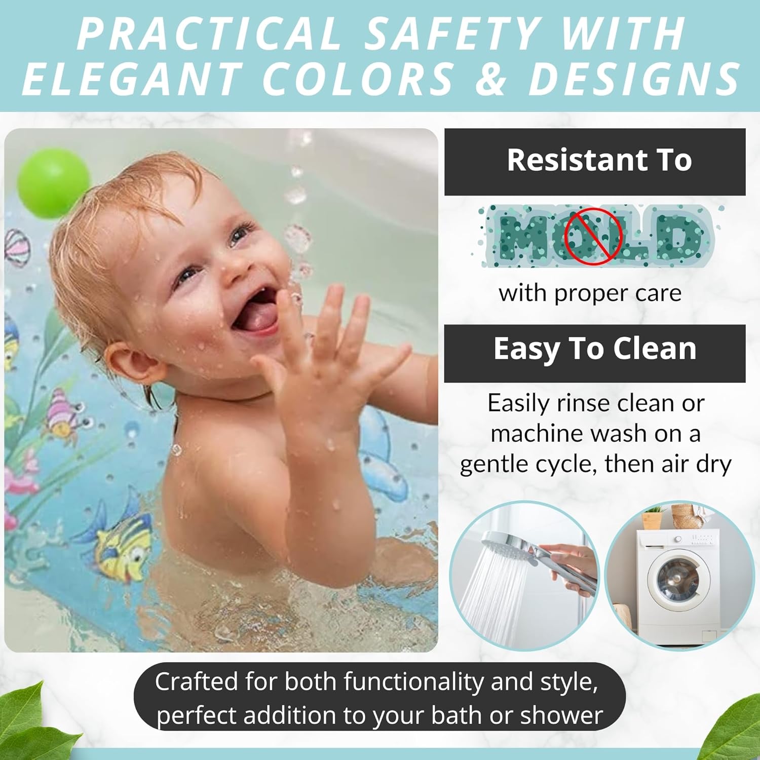 - EASY TO CLEAN Crafted from durable, easy-to-clean, and safe materials, this bath mat simplifies maintenance. Rinse it in the shower or tub, or toss it in the washing machine for a quick and convenient clean.