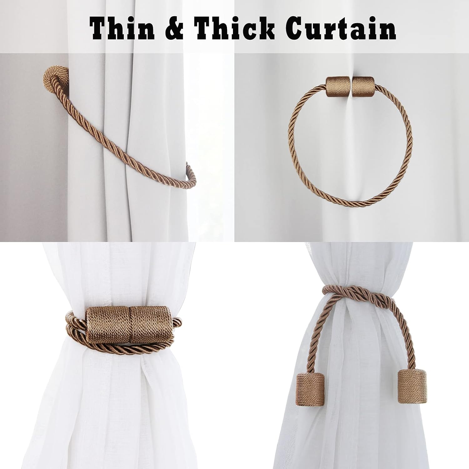 - 4 pack beautiful rope magnetic curtain tiebacks, Weight of 1 Pack- 0.12lb, Total Length - 17.5", Rope Diameter- 0.4". Could be twisted to adjust the length to meet your need, so no need to worry about the size is too big, suit for thin curtains, sheer curtains, thick shower curtains. You can refer to the various bundling methods shown on our pictures.