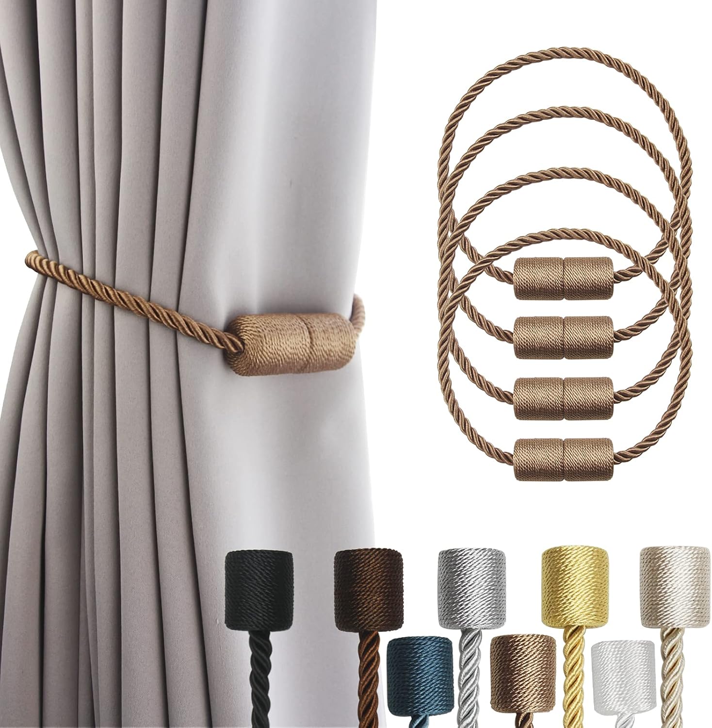 4 Pack Strong Magnetic Curtain Tiebacks Outdoor Elegant Decorative Tie Backs Modern Rope Tiebacks for Drapes Window Curtain Holdbacks for Draperies- Khaki