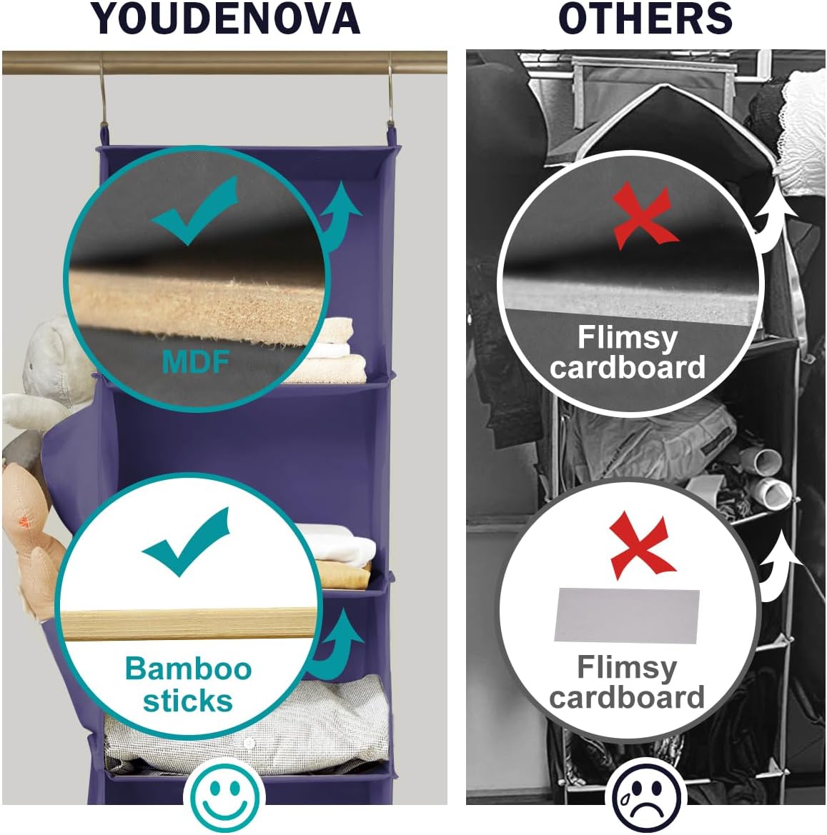 - HIGH QUALITY: This hanging closet organizer is made of sturdy and thick non-woven, built to last. Unlike some similar product, this one has 2 pcs sturdy bamboo inserts at each shelf and MDF board at top & bottom, which can avoid the compartments bending.