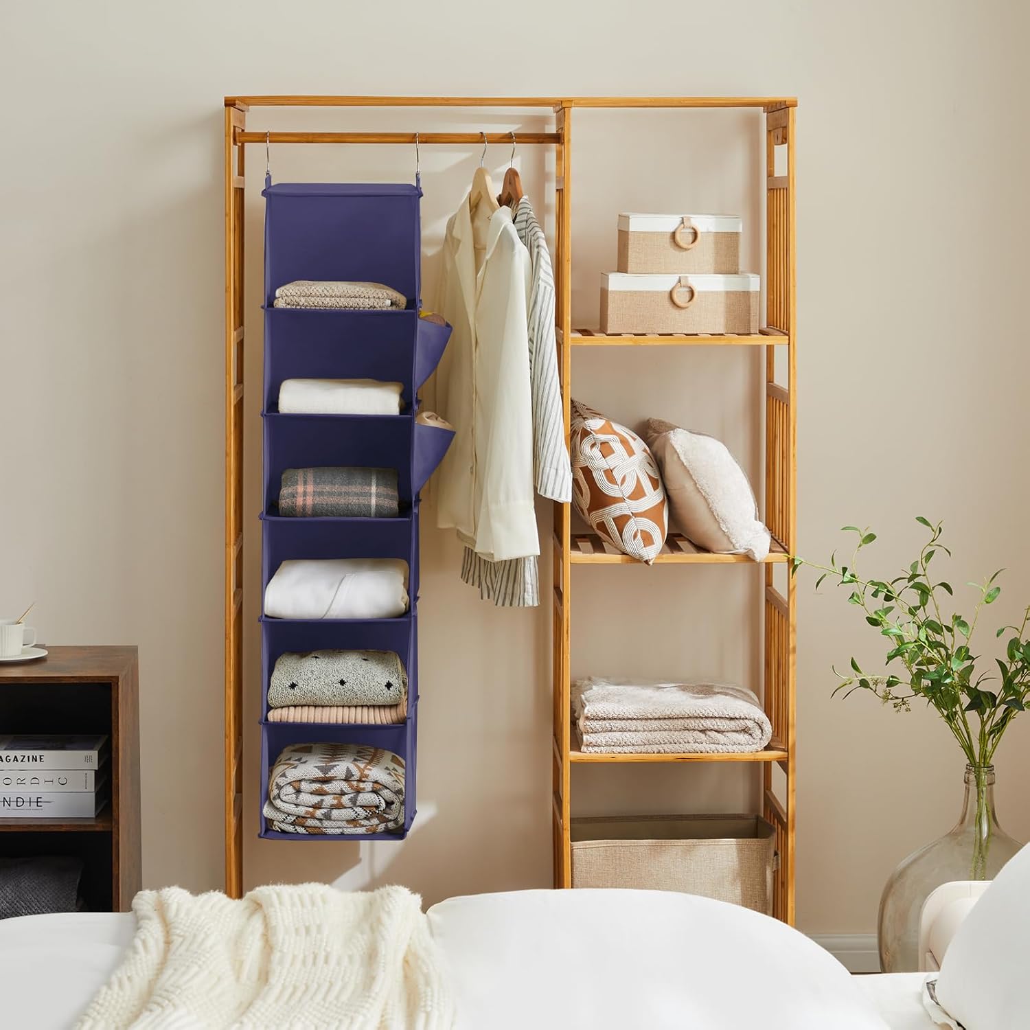 - SUITABLE: The closet hanging storage allows you to have more space in your closet. It has six shelves units. This shelf organizer is suit for people who need more storage, but they do not have space in their closet. Also, it is for people who want to use their space more efficiently.