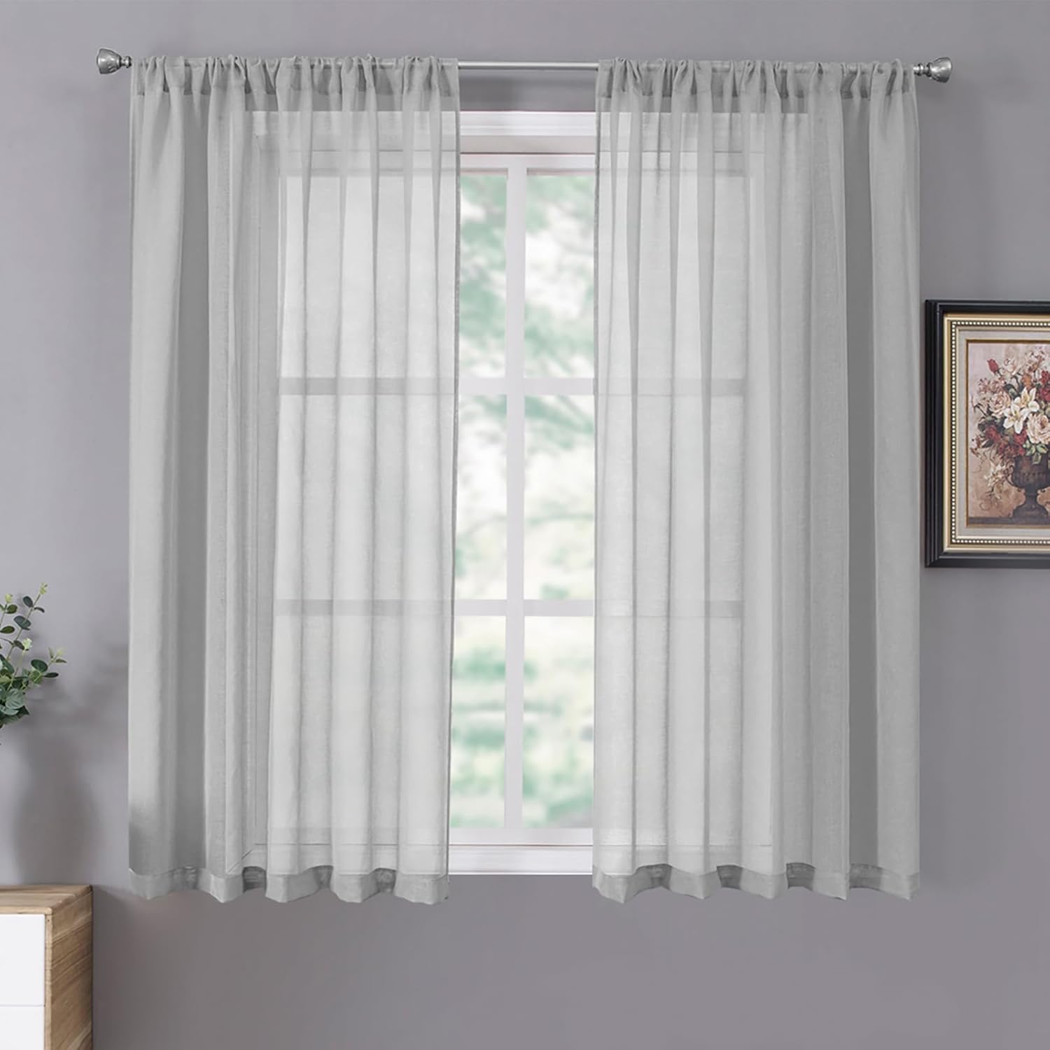 Tollpiz Short Sheer Curtain Linen Textured Living Room Curtains Sheer Light Filtering Rod Pocket Voile Curtain for Bedroom, 42 x 54 inches Long, Silver Grey, Set of 2 Panels