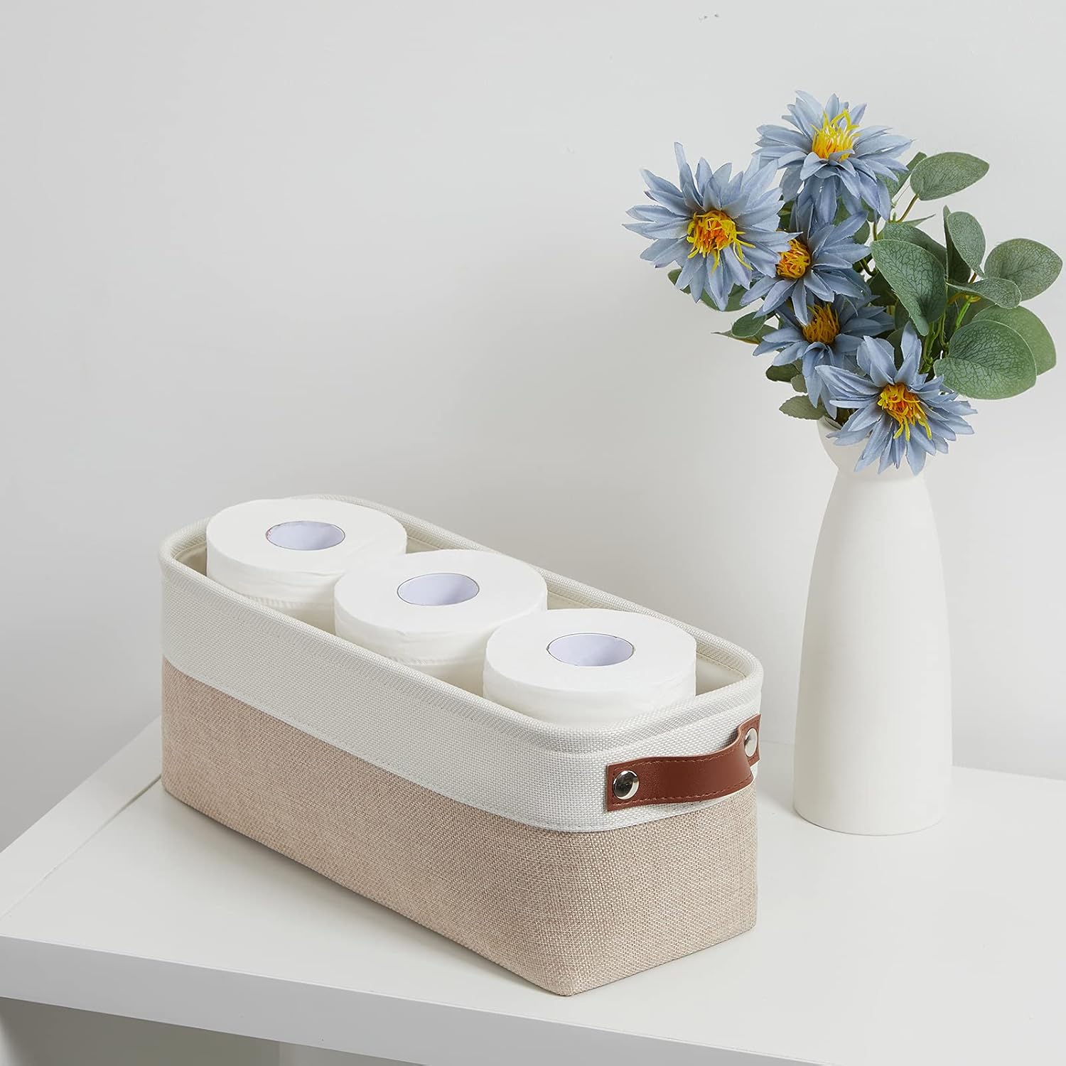 DULLEMELO 2-Pack Bathroom Baskets for Toilet, Small Storage Bins for Organizing Closets, Cabinets, Shelves, Canvas Fabric Storage Basket Bins With Leather Handles for Empty Gift Basket (White&Khaki)
