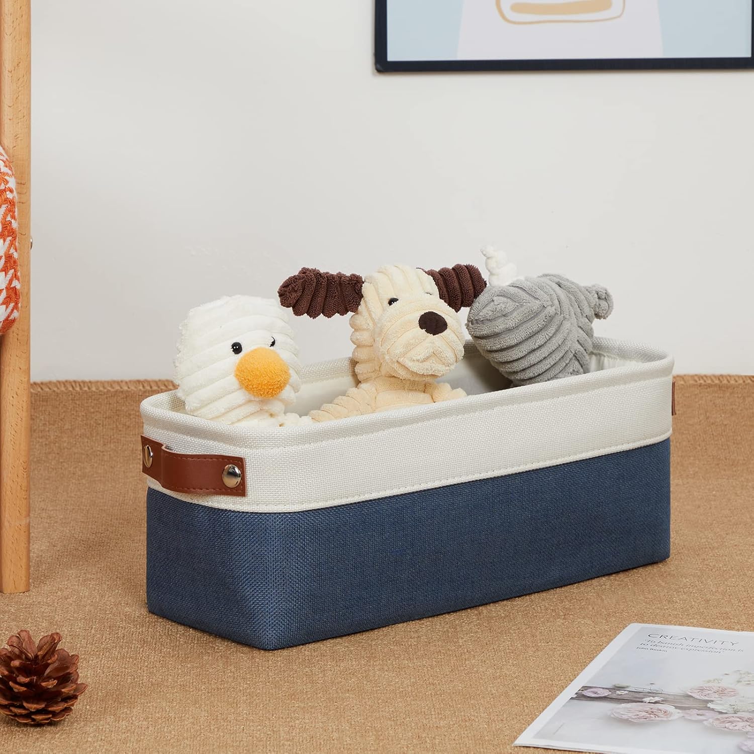 - 【Unique Design & Modern & Decorative】Set of 2 small toilet paper baskets, dimensions(each): 15(L) x 6(W) x 5.5(H) inches. Fabric storage baskets bring you organizing convenience and a sweet home. Great for socks, underwear, books, magazines, toys, pet products, wipes, towels, decorations, office supplies, DVDs, and gifts. The fabric baskets with neutral colors can match a lot of home styles - keeping your home nice and tidy.