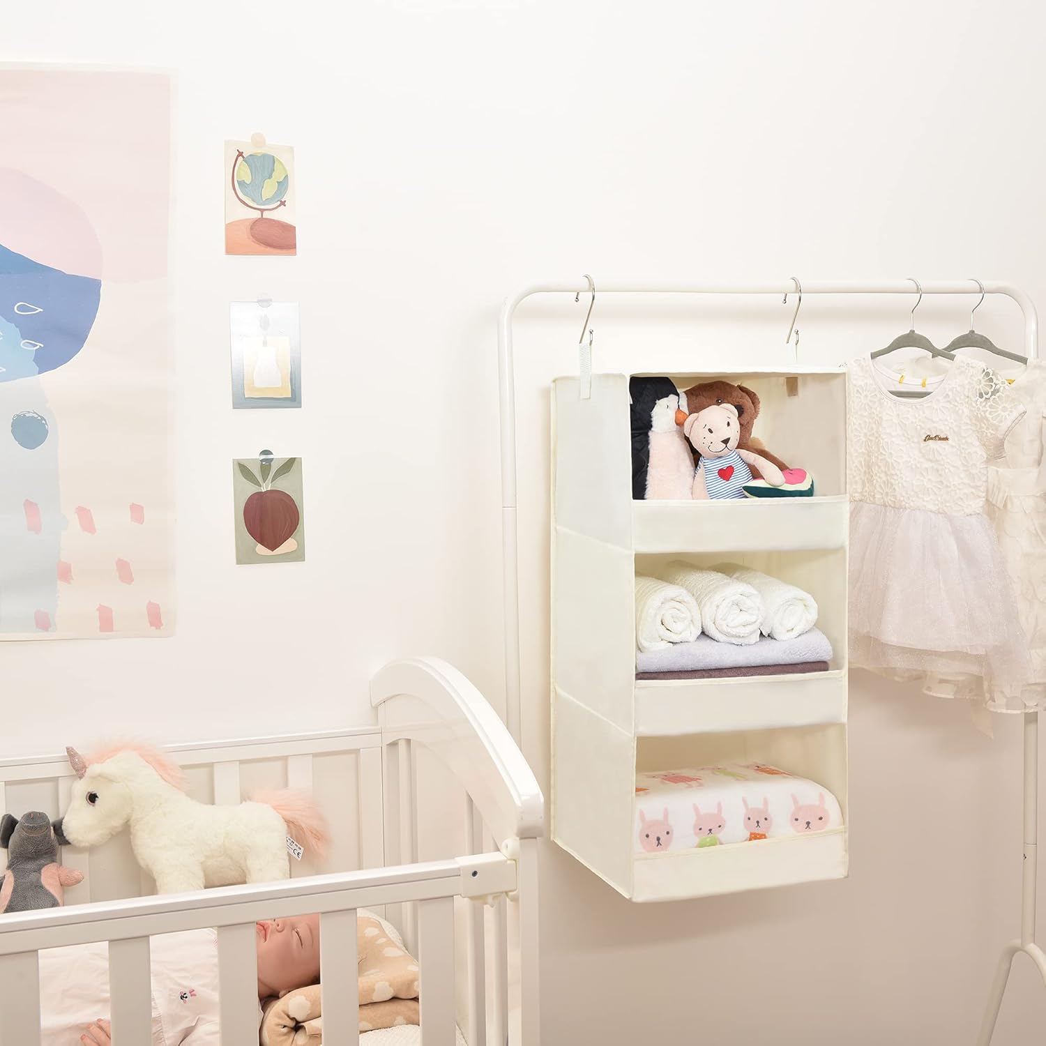 - 3-shelf organizer works great in closets, shelves, wardrobes, RVs, camper trailers for storing towels, T-shirts, socks, accessories, bibs, diapers, baby wipes, etc.