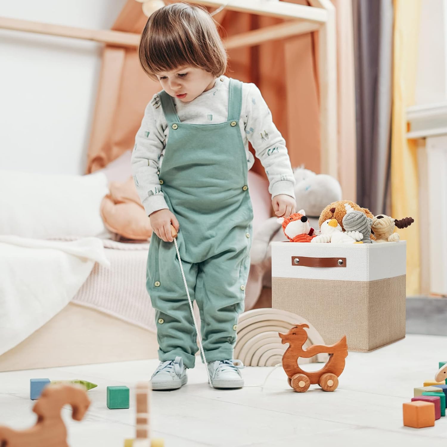 DULLEMELO 11 inch Cube Storage Bins,Fabric Storage Cubes for Organizing,Collapsible Foldable Linen Canvas Closet Storage Bins for Shelves Closet Bedroom Toys Home Office(White&Khaki)