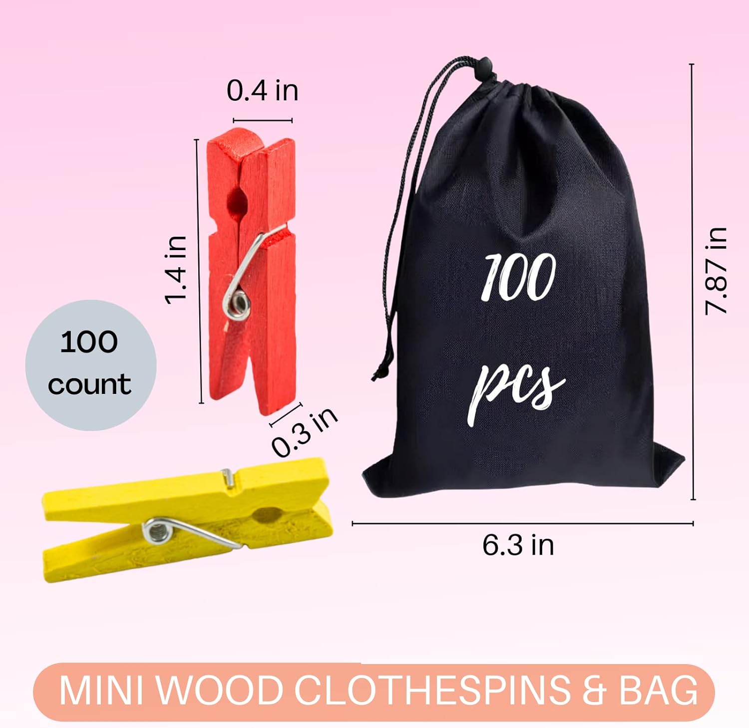 Clothespins, Small Clothes Pins for Photos, 1.4'' 100 PCS Natural Birchwood Mini Clothes Pins, Strong Springs Colorful Clothespins with Storage Bag, Mini Clothespins for Photos, Crafts, Pictures, Art