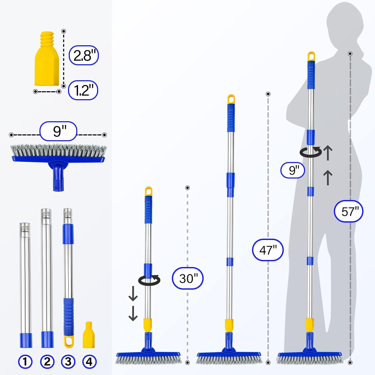 - Easy to Install & Sturdy Construction: The floor scrubber brush is easy install. Screw on method design allows your assmble the long handle scrub brush instantly. Durable threaded connection between the cleaning brush head and handle ensures sturdy construction. No need to worry about the grout scrub brush head comes off from the handle.