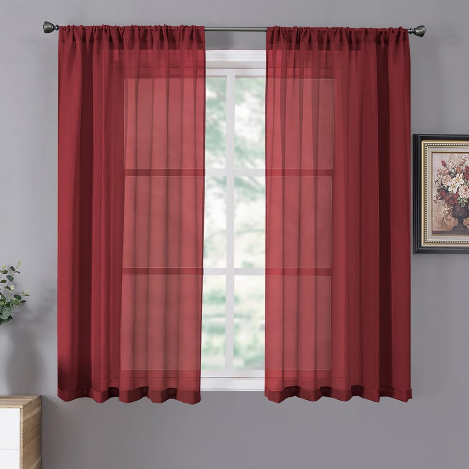 Tollpiz Sheer Curtains Linen Textured Bedroom Curtain Sheers Light Filtering Rod Pocket Voile Curtains for Living Room, 54 x 63 inches Long, Burgundy Red, Set of 2 Panels