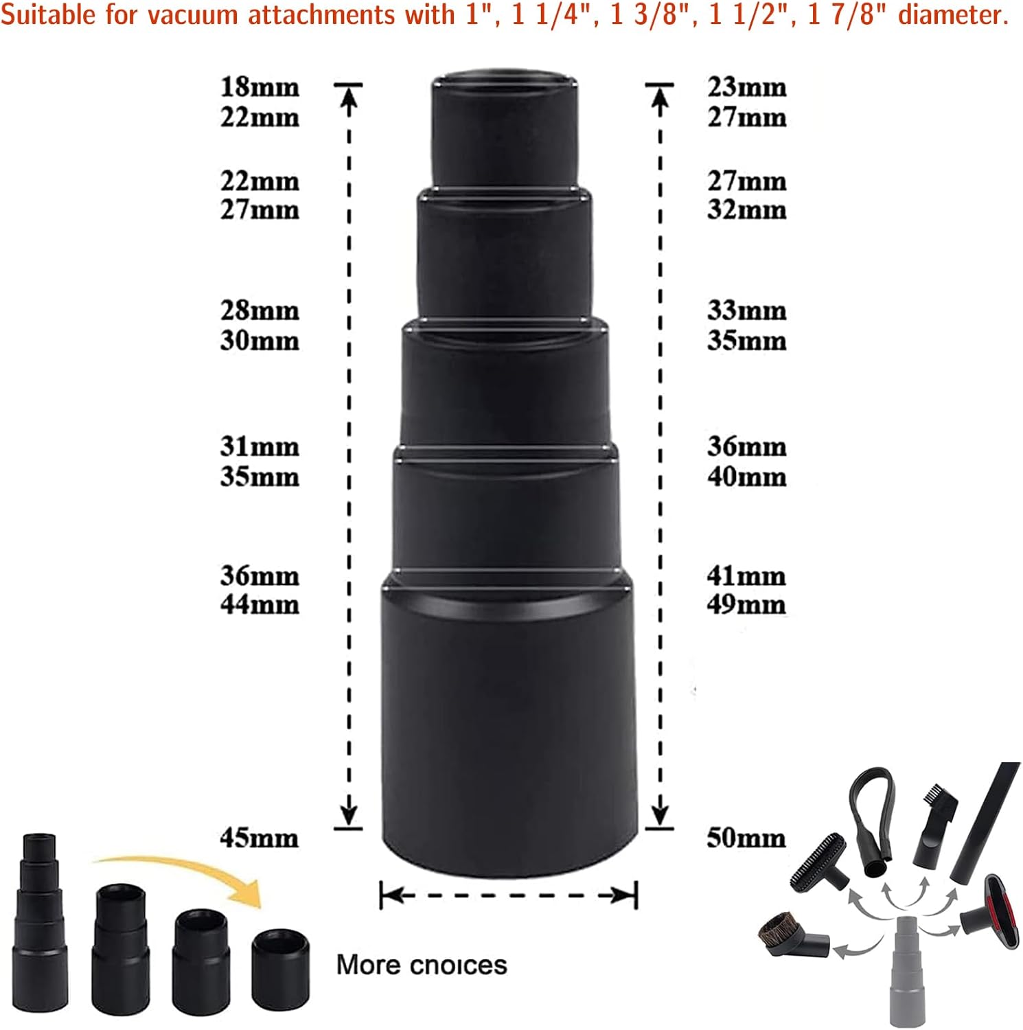 - 5-Tier Adapter: Standard vacuum adapter fits outside diameters of 27mm, 32mm, 35mm, 40mm , 50mm. For shop vac accessories with inside diameters of 1" (25.4mm), 1 1/4'' (32mm), 1 3/8'' (35mm), 1 1/2'' (39mm) and 1 7/8" (49mm). The vacuum adapter can be easily cut into 5 sizes of connectors to meet your different needs.