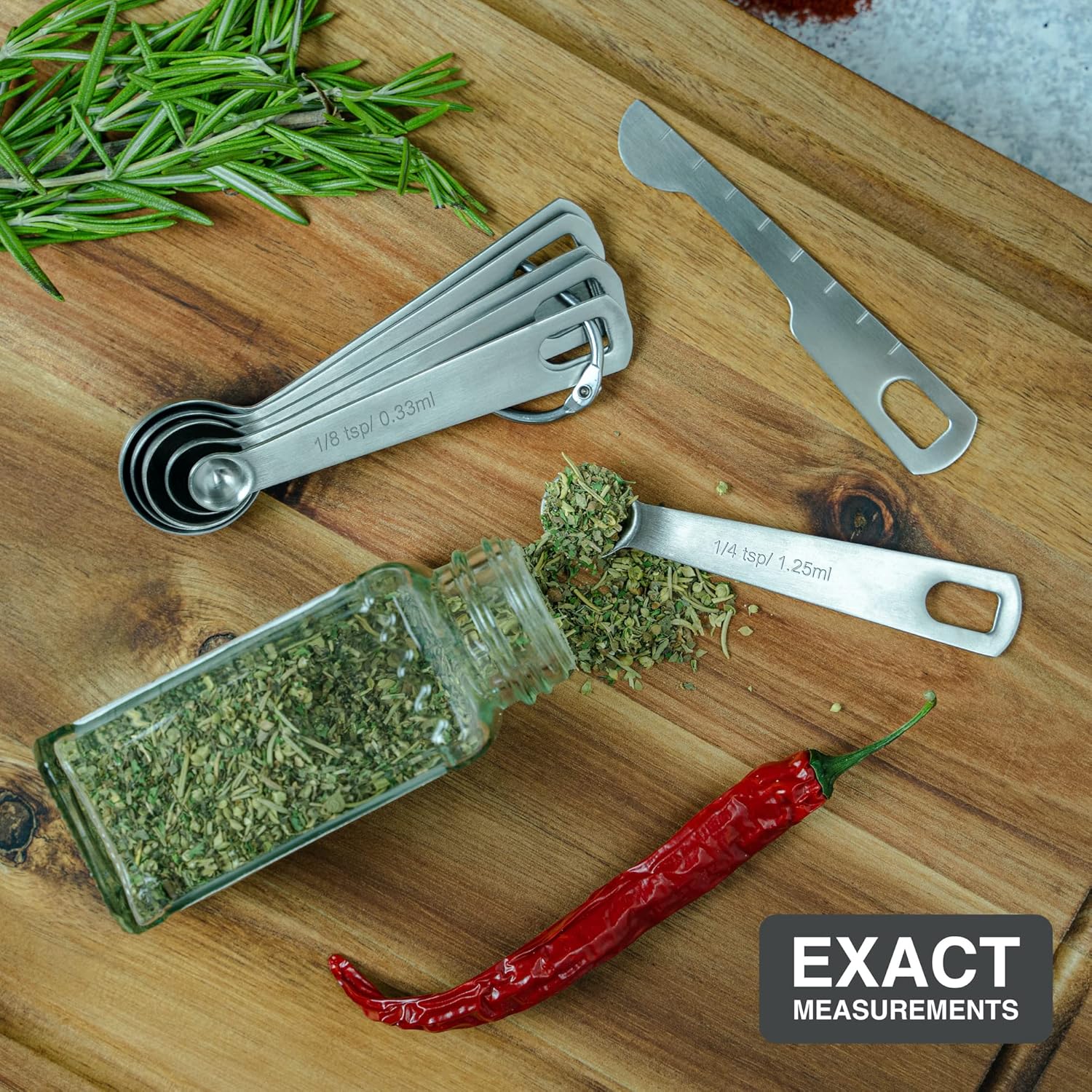 - Ultimate Precision - Each Spoon meets the ultimate precision of measure and is labeled in U.S.A. and Metric units for easy and quick measurements when needed. This set comes in 1 Tbsp(15ml), 1/2 Tbsp(7.5ml), 1 tsp(5ml), 1/2 tsp (2.5ml), 1/4 tsp (1.25ml), 1/8 tsp(.63ml) and Leveler.
