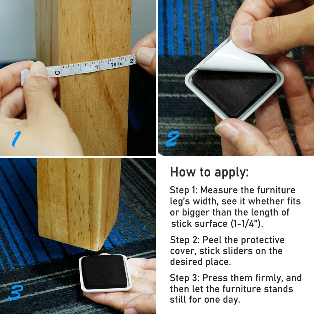 - WIDE APPLICATION - With strong adhesion, the carpet sliders can be easily stick to wood, glass, metal, plastics, widely used on dining table, desk, chairs and other furniture legs fit the size