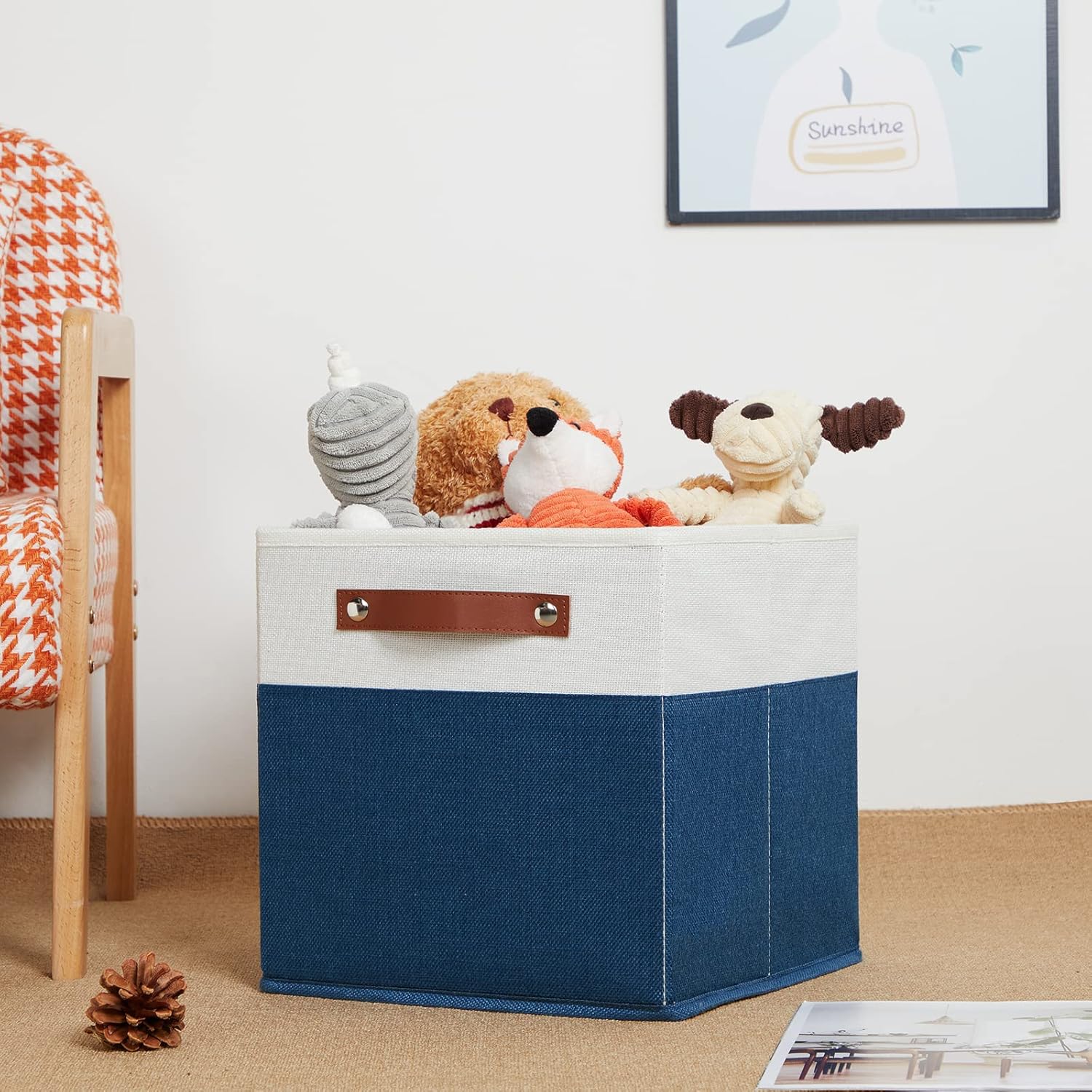 - 【Sturdy Leather Handles 】Sturdy thickened leather handles and metal iron buckles make them easy to carry even with a heavy load. Cardboard is inserted at the bottom and sides to provide support, so that these decorativecube storage bin to stand on, holding the shape well and can be used for a long time