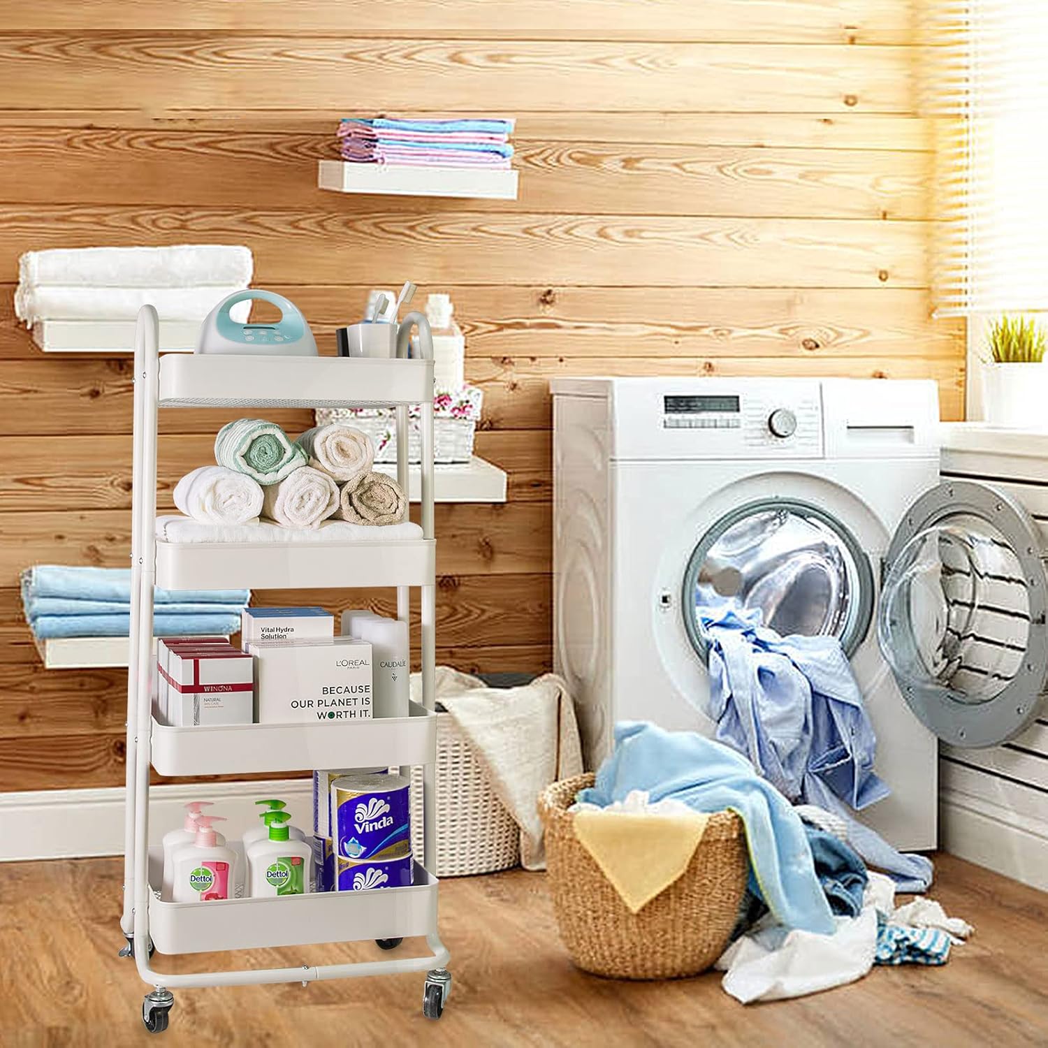 - [Multifunctional Storage Cart] This 4 tier rolling utility cart is easy to store and transport. It can be used as a tools cart, service cart, book cart, art cart, organization rack and more. Suitable for your office, bedroom, kitchen, bathroom, living room, baby room, laundry room, pantry, studio, classroom, and craft areas.