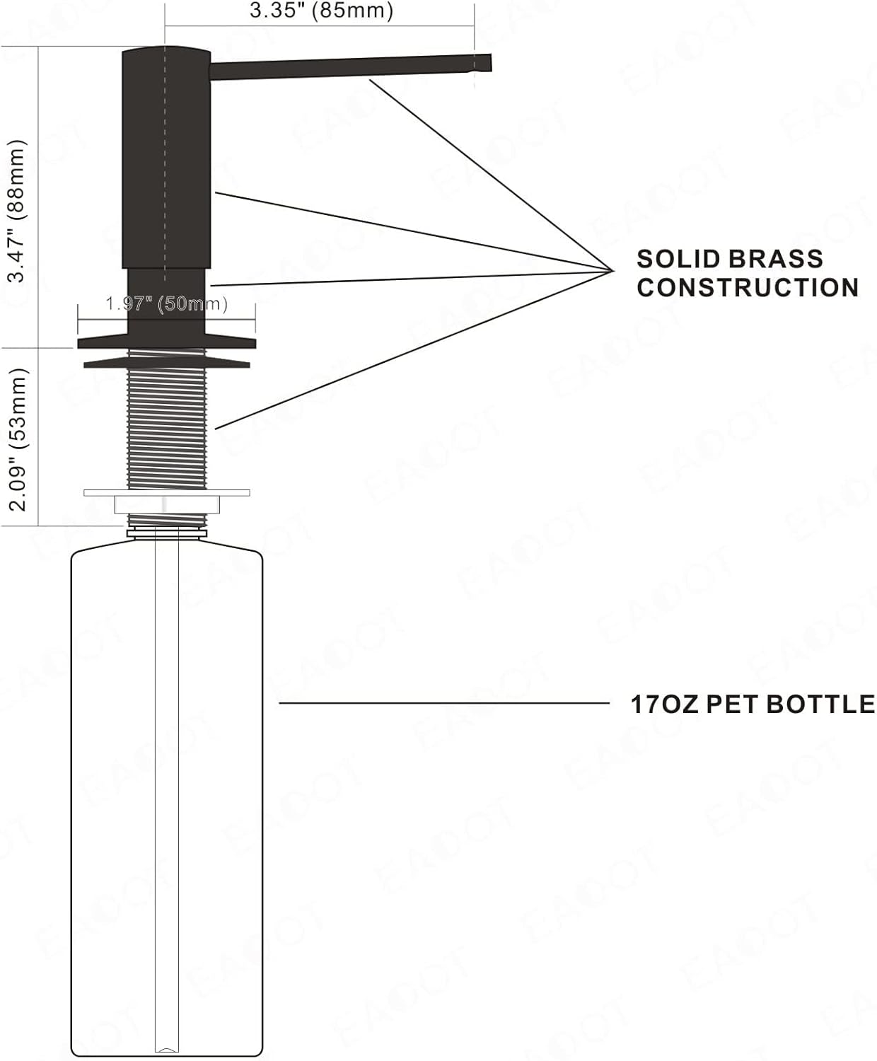 - ️Built To Last:Sturdy built in sink soap dispenser for kitchen sink, solid brass pump head and threaded tube with 17 OZ PET plastic bottle, corrosion resistant spring. SOLID BRASS CONSTRUCTION brushed nickel rust resistant finish that will not tarnish as time goes on. The soap dispenser pump mechanism is designed for long lasting excellent performance to dispense consistently with each and every press. Coordinates with most faucet models from different brands.