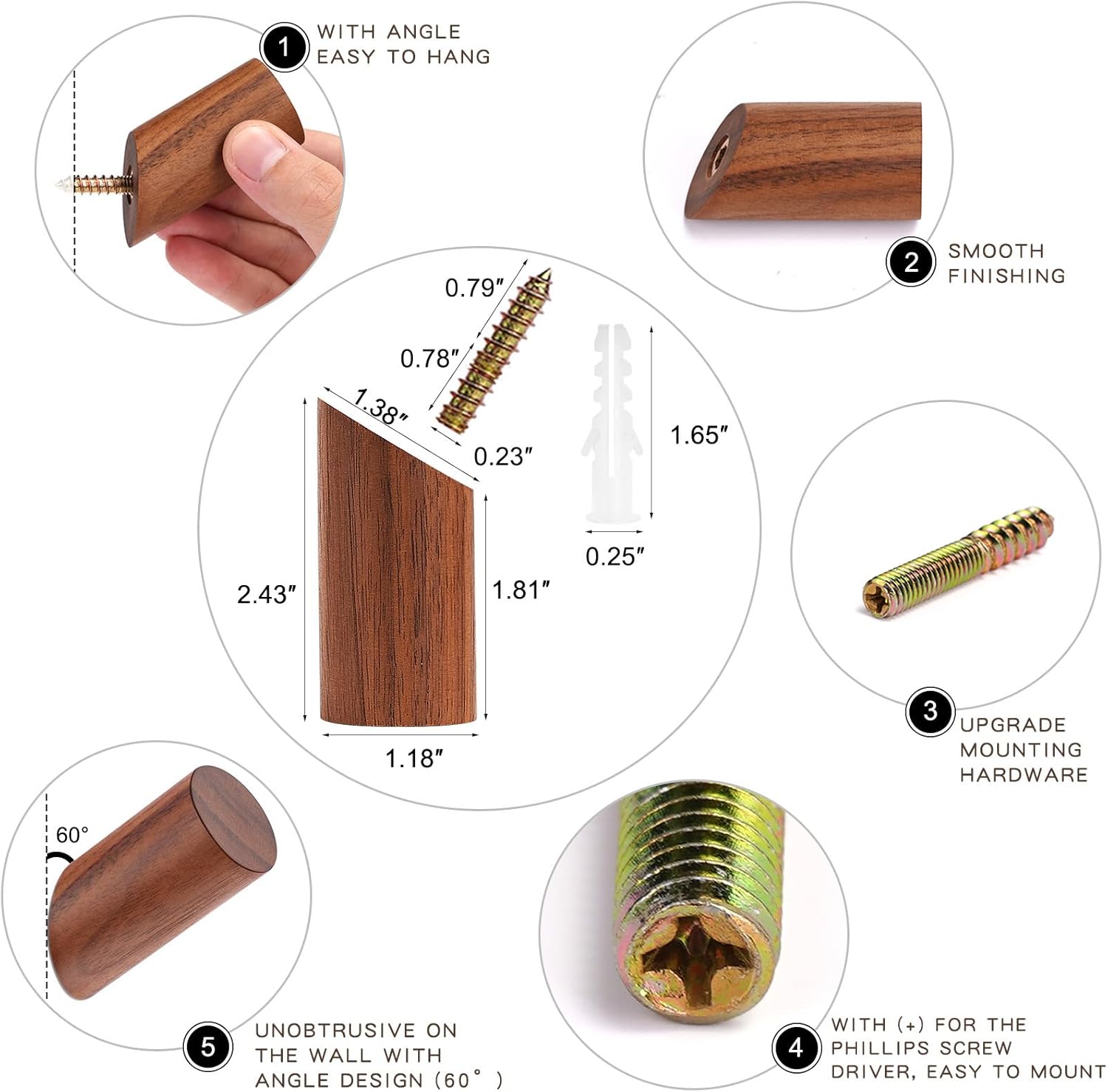 - EASY TO INSTALL – We have UPGRADED the screw with a notch (+) for the Phillips screwdriver. So it is easier to install. 1) Drill a hole. 2) Hammer the anchor into the wall. 3) Screw into the wall anchor with a driver. 4) Twist the wood-hook into the screw and tighten it to the wall with a proper angle (mounting hardware included)