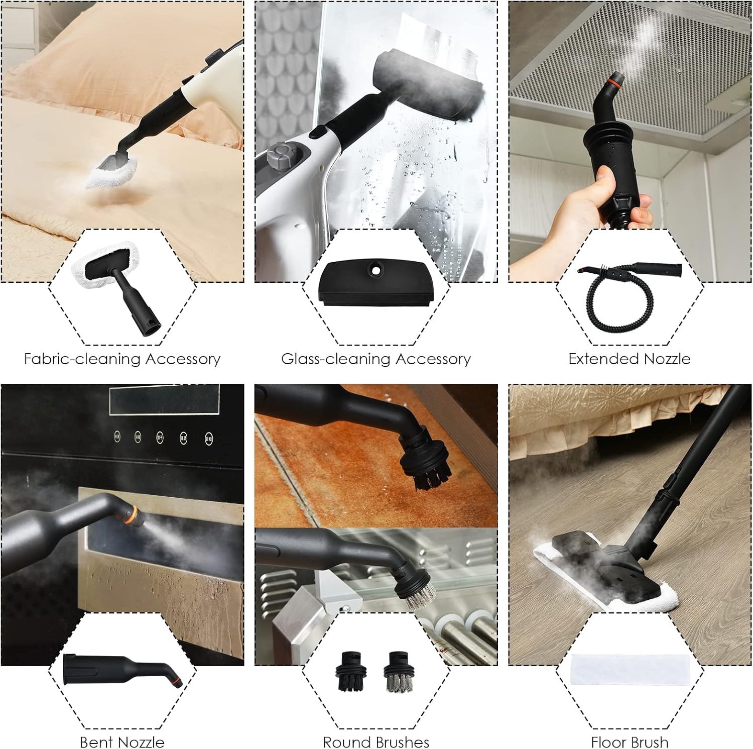 - 🏠【Complete Accessory Set】The steam cleaner comes with a complete set of cleaning accessories, including nylon brush, floor brush,big nozzle, funnels, measuring cups, etc.,to meet different cleaning needs. The handheld steamer is great for cars, mattresses, wallpapers, windows, stoves, countertop, sofas and other sealed surfaces such as ceramic, glass, marble, hardwood floors, etc.