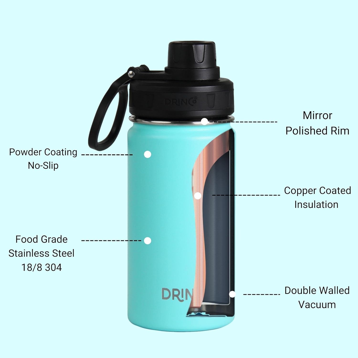 - ✅ Premium Quality: The Drinco water bottle is constructed with rust-resistant (18/8) food-grade stainless steel double walled body, a material lauded for its durability. The powder coating paint treatment makes the insulated water bottle virtually indestructible, scratch resistant and restricts temperature transfer.