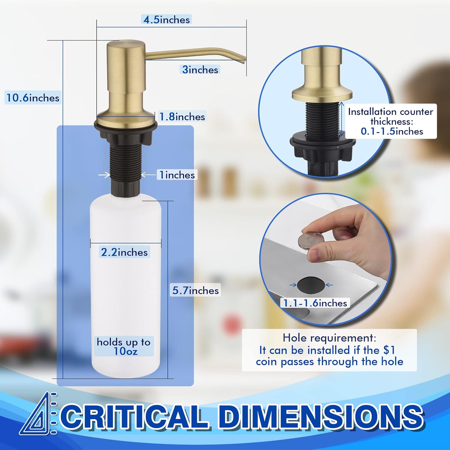 - 【Solid and Durable】Your under sink soap dispenser for kitchen is made with exterior commercial grade 304 stainless steel and interior durable PE plastic for higher durability and reliability. The premium brushed gold finish makes it resistant to corrosion and rust.