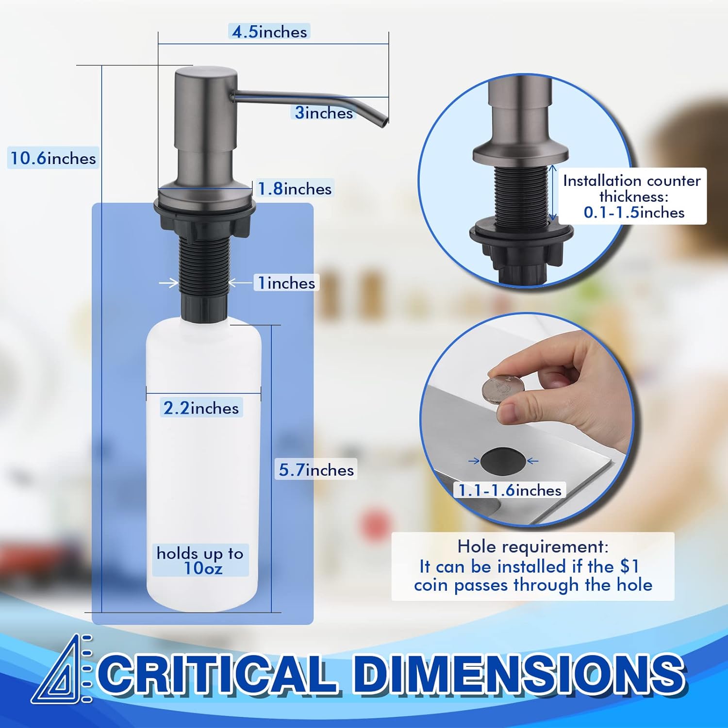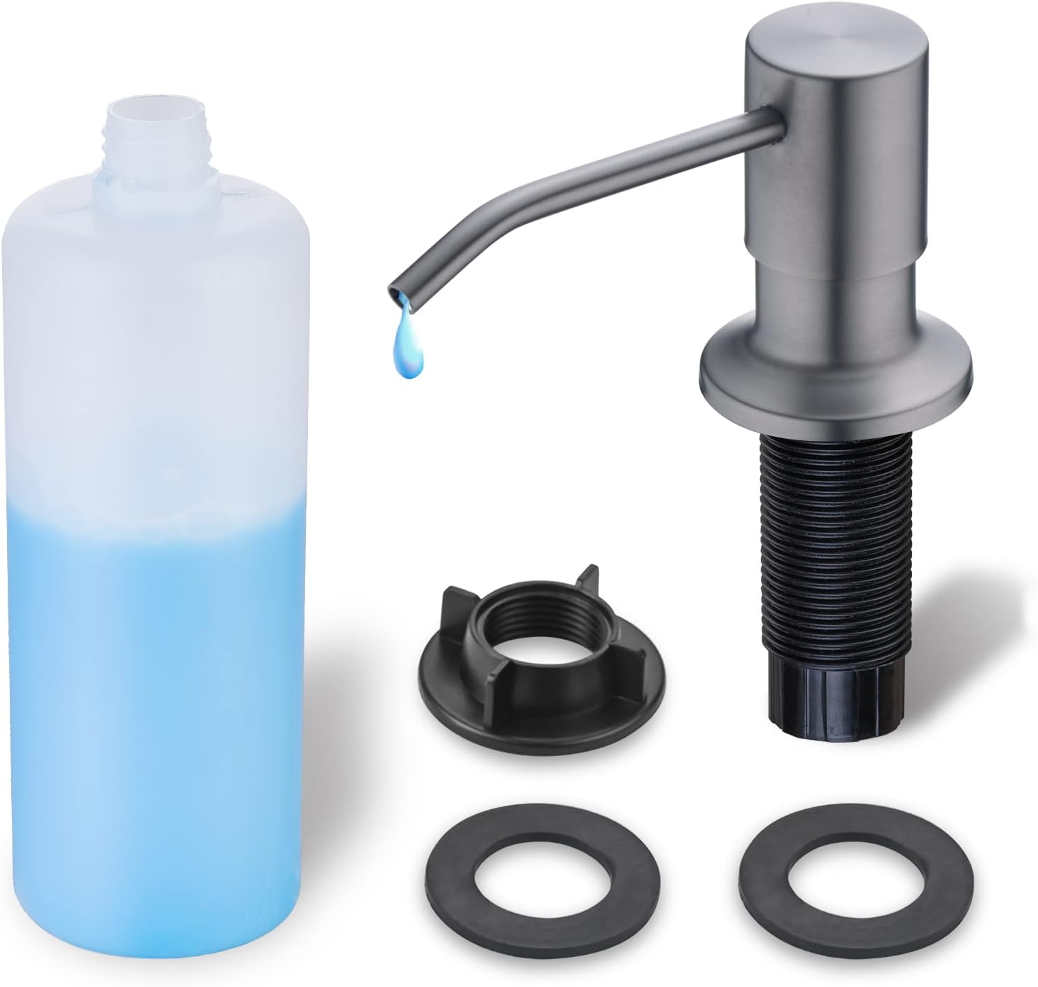 - Optimization Design: First-rate matte gray under counter soap dispenser makes your kitchen simple and fresh, easy to fit most sinks. Installing it in any type of kitchen sink or countertop (granite, stainless steel, wood)makes it more convenient to use.