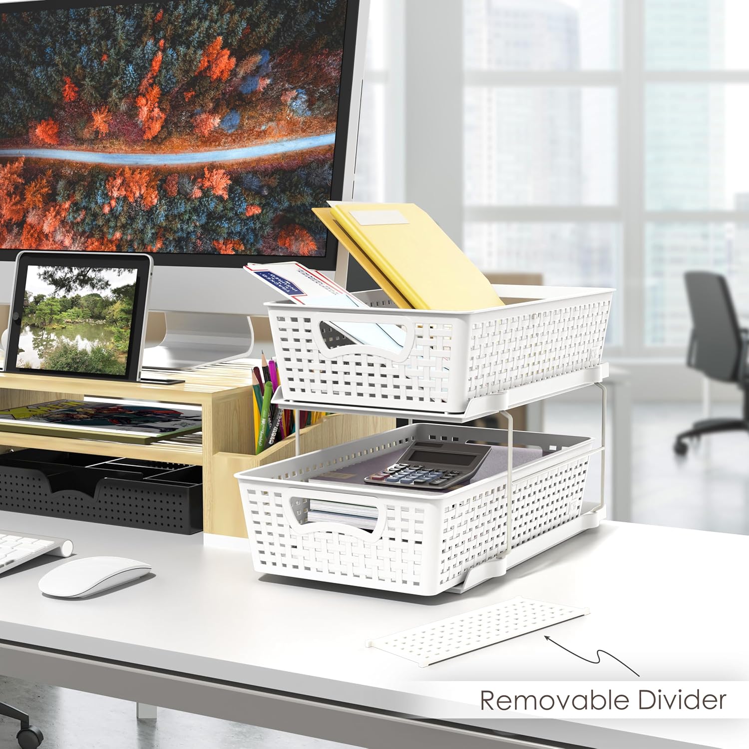 - Two drawers with dividers. Great for kitchen, bathroom and storage room organization. Gain more space in the cabinet, pantry room or even open space