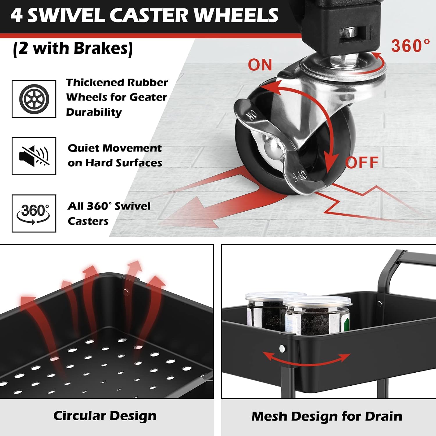- Easy & Convenient to Move: This 3-Tier storage cart comes equipped with 4 wheels (2 lockable) and the handle design makes it easy & convenient to roll around to anywhere you need, or lock it in place.
