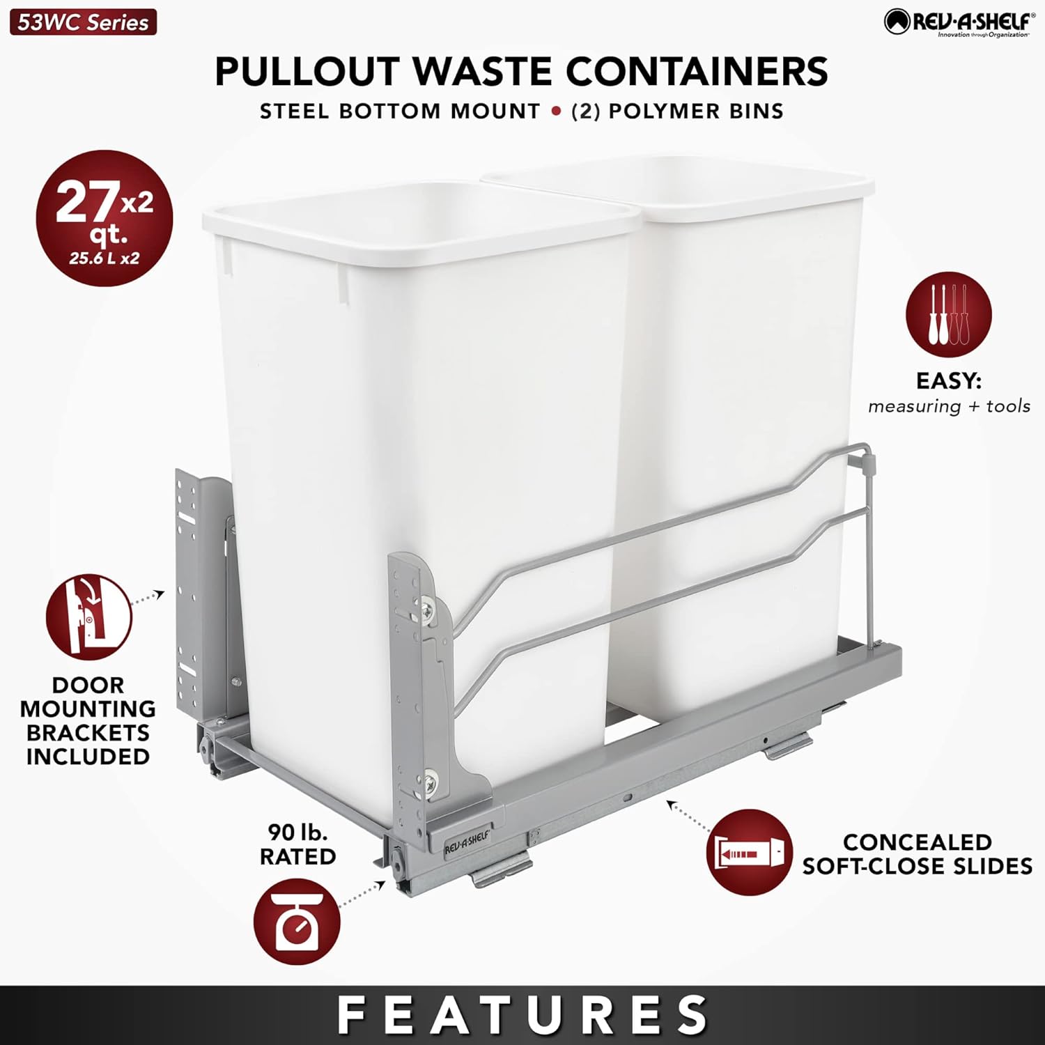 Rev-A-Shelf Double Pull-Out Trash Can for Under Kitchen Cabinets 27 Quart 12.5 Gallon with Soft-Close Slides, White, 53WC-1527SCDM-211