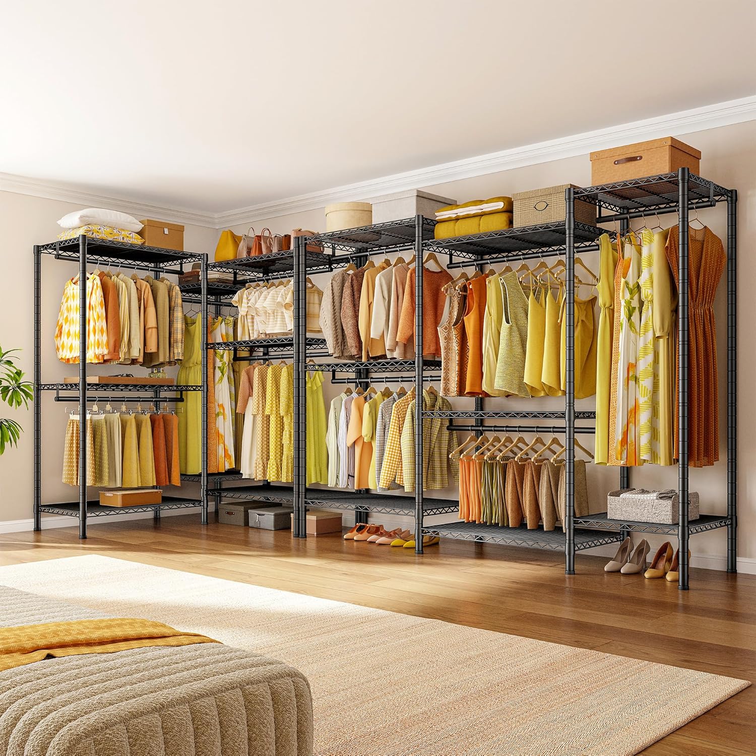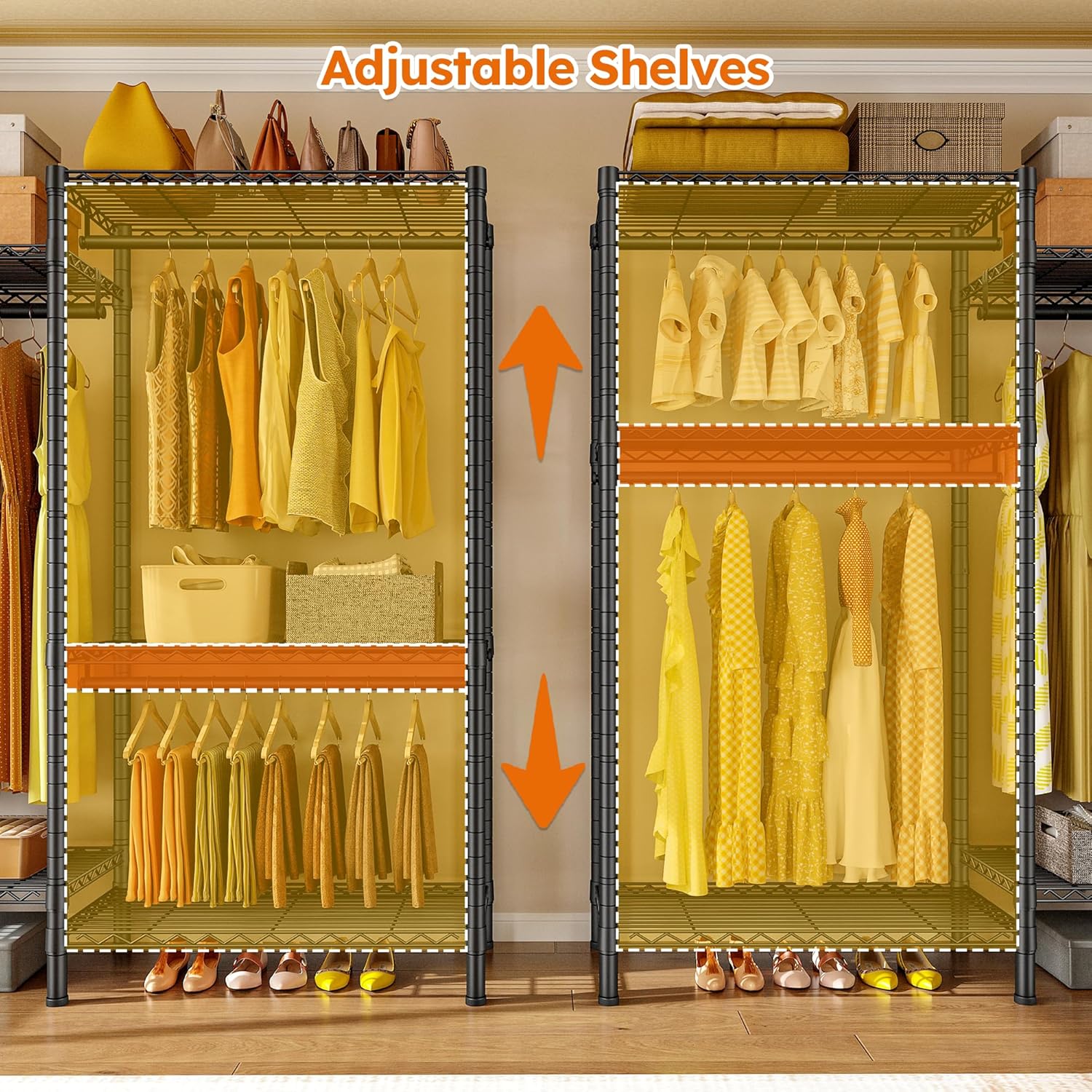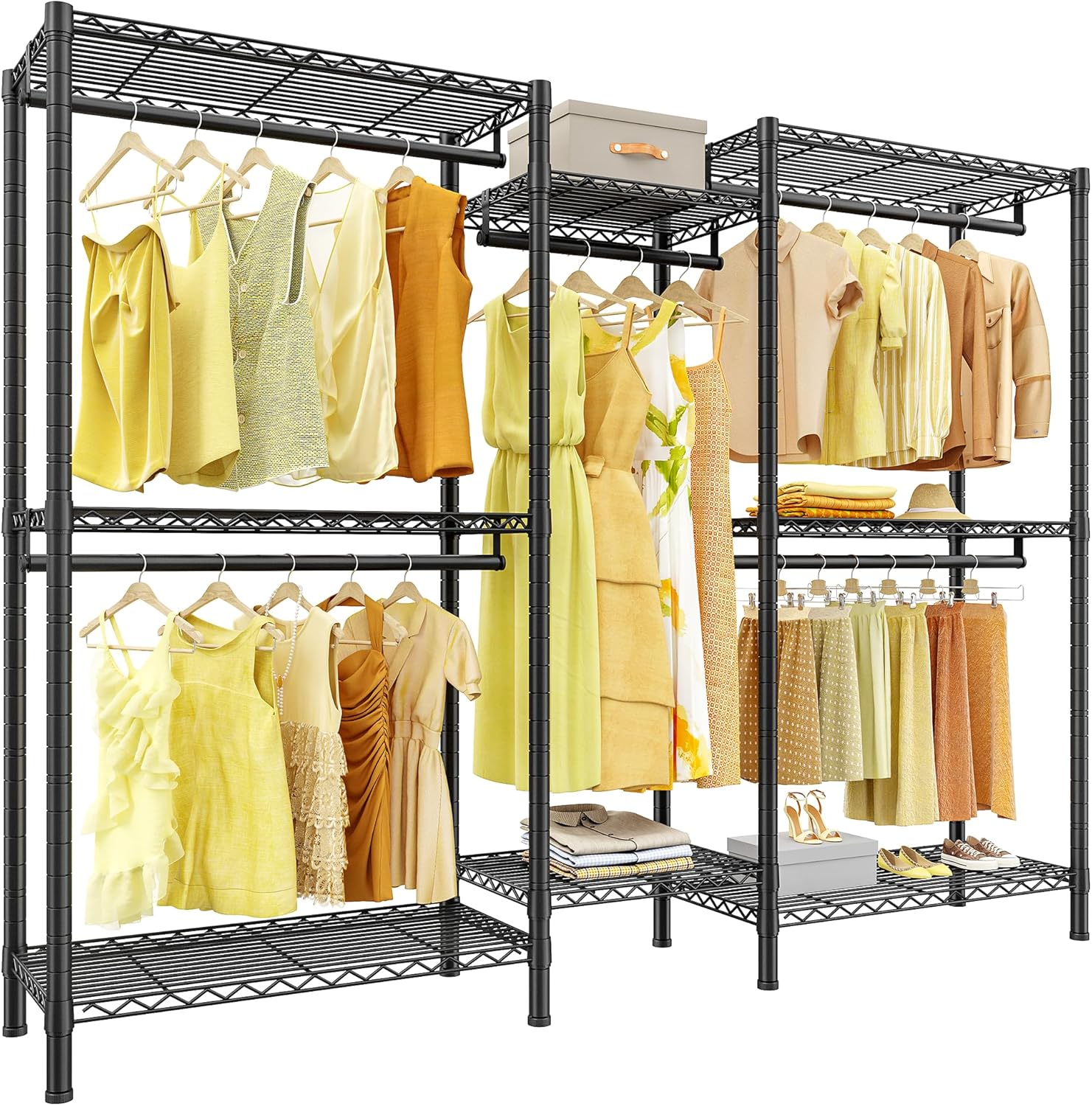 - 【Fully Adjustable & Easy-to-Adjust】This wardrobe rack has 8 wire board(110Lbs capacity per tier) and 5 hanging rods(80Lbs capacity each), they are all easily adjustable and detachable by the slip-sleeve locking system, all you need to do is assemble the clips higher or lower. An Ideal DIY garment rack meets all needs.