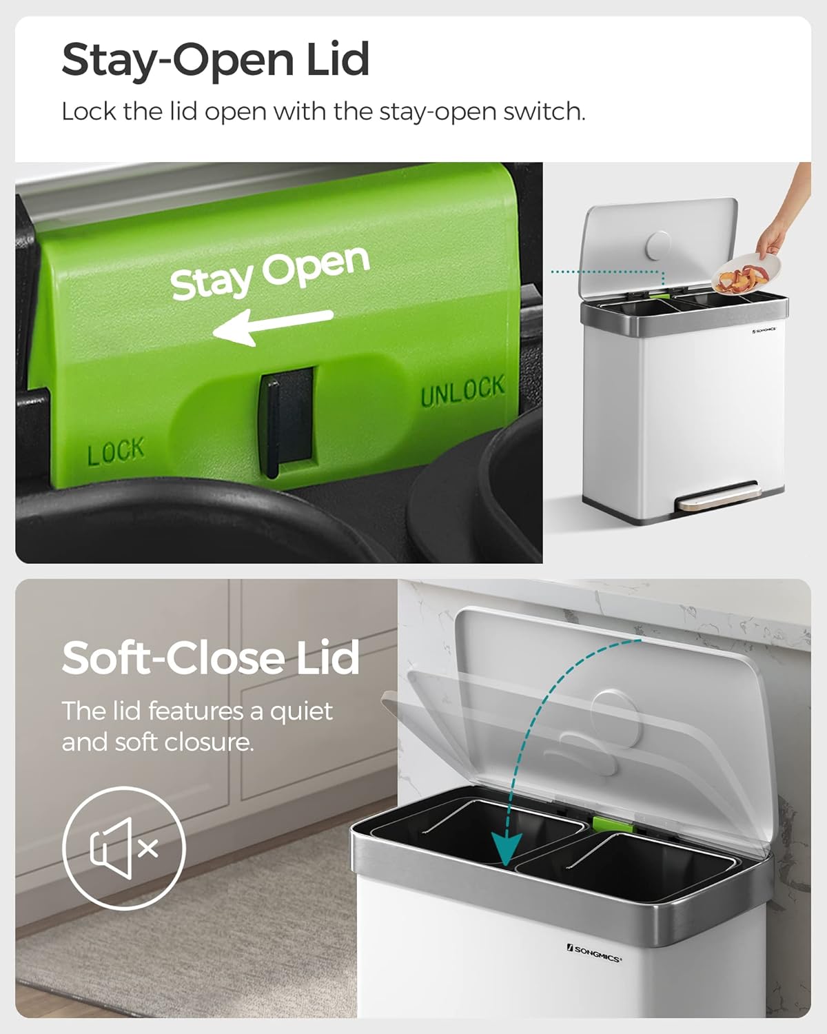 - [Dual Compartments & Liners] With two 8-gallon compartments, this dual trash can helps sort normal waste and recyclables in your kitchen; it comes with 15 custom-fit SONGMICS trash bags (code 30A), which are designed to perfectly fit this garbage can