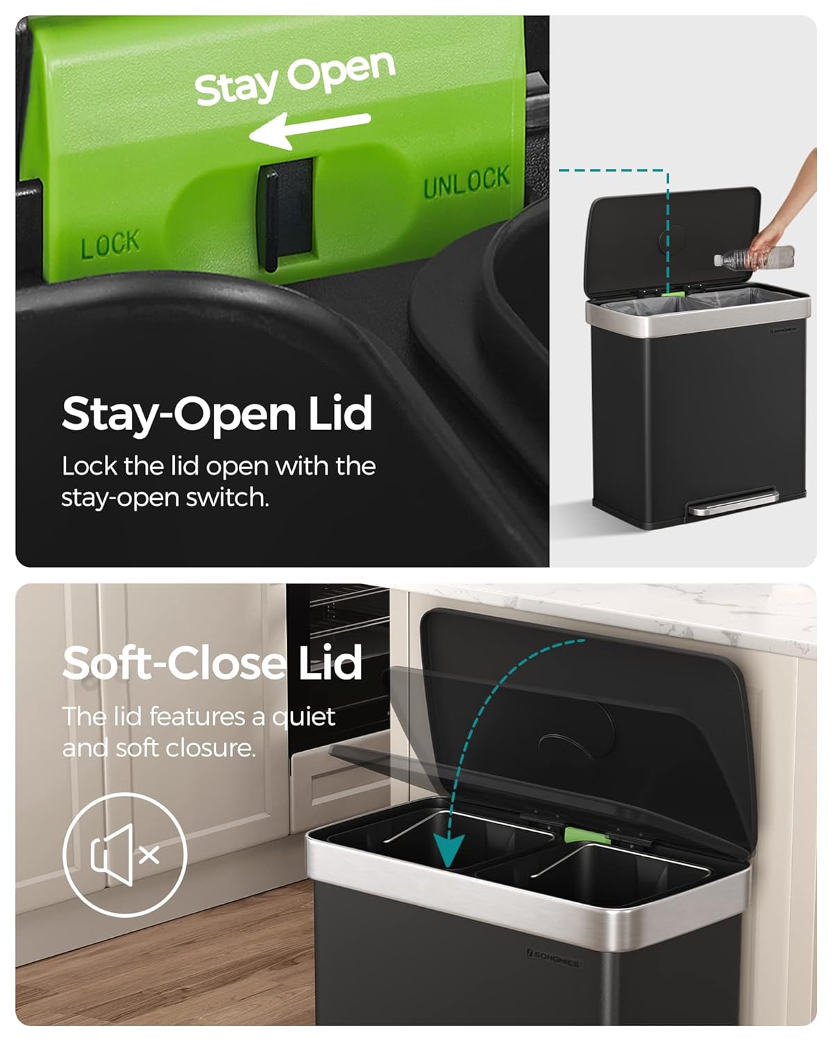 - [Dual Compartments & Liners] With two 8-gallon compartments, this dual trash can helps sort normal waste and recyclables in your kitchen; it comes with 15 custom-fit SONGMICS trash bags (code 30A), which are designed to perfectly fit this garbage can