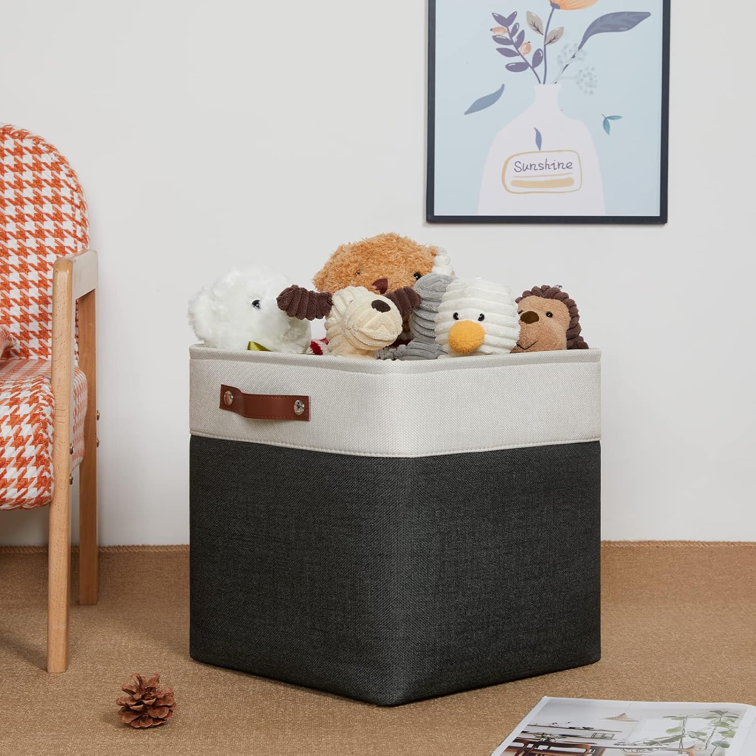 - 【Premium Quality And Leather Handle】The outside of these cube storage baskets are made of EV material and the inside is linen. The EV material makes the whole product more three-dimensional, and the linen closet organizers and storage baskets inner layer is more comfortable. No worry about sturdy issue, there is metal bracket to support it. The basket with leather handle is easy to grab and the quality of construction is very good.
