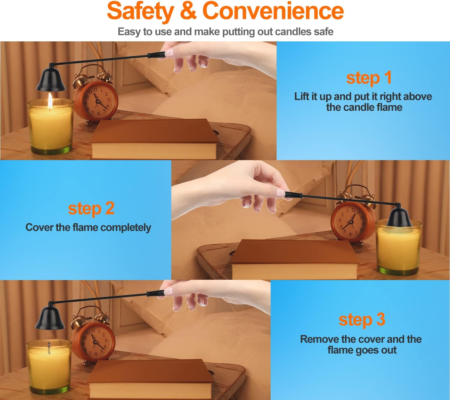 - SAFE & CONVENIENCE:Candle snuffer with long handle is the safest way to put out a flame and help candles burn more evenly! Swivel head candle extinguisher make it easy to snuff out the flame from any angle instantly. Will be a very handy tool to have.