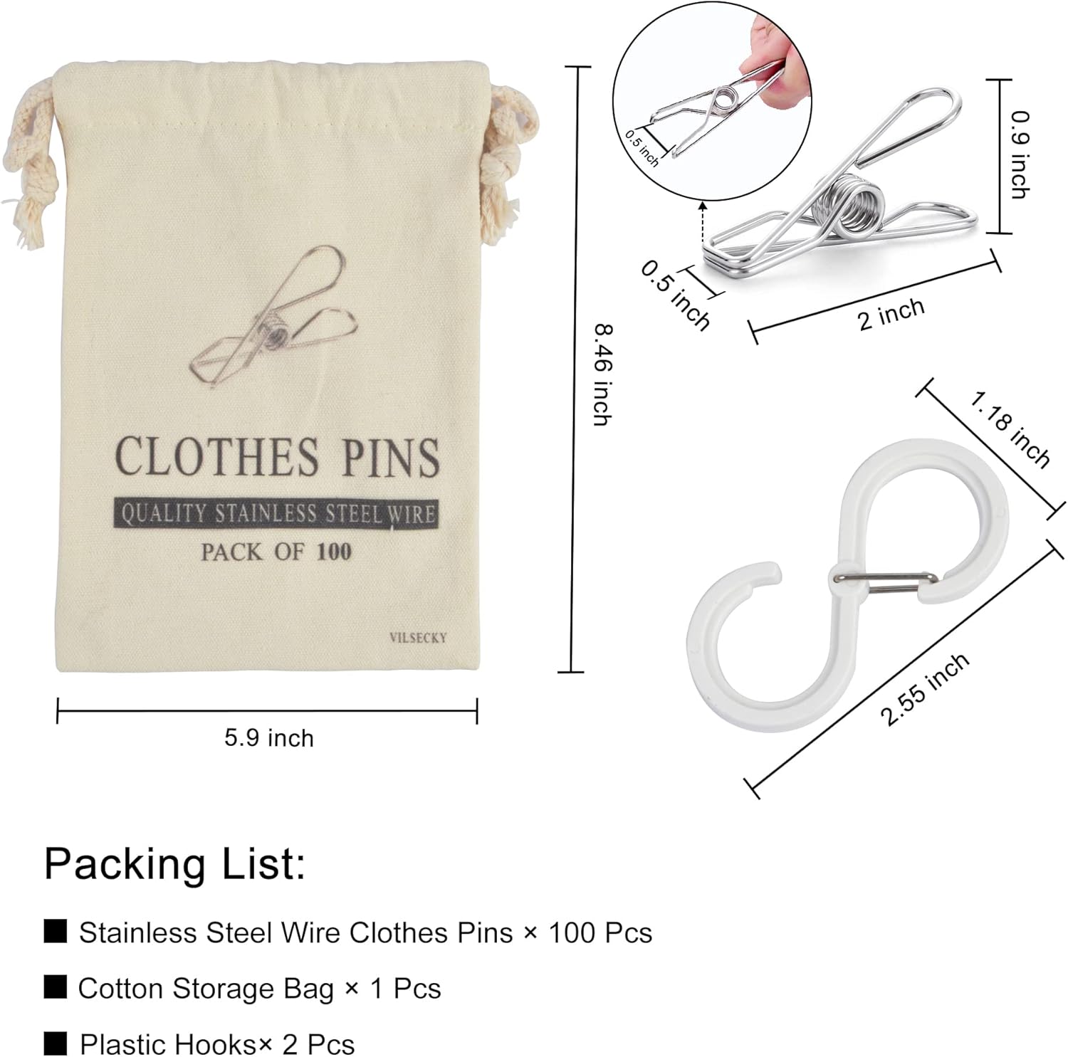 - Package Included : Our clothespins set comes with 100 Pcs stainless steel wire clips,appro size:2" x 0.5" x 0.9" (L x W x H),1 Pcs well-made cotton clothespins storage bag with drawstring,appro size: 8.46" x 5.9" (L x W),2 Pcs plastic hooks,appro size: 2.55" x 1.18" (L x W).The accessories-hanging storage bag and hooks will help to organize the clothes pins well and locate them where you need.