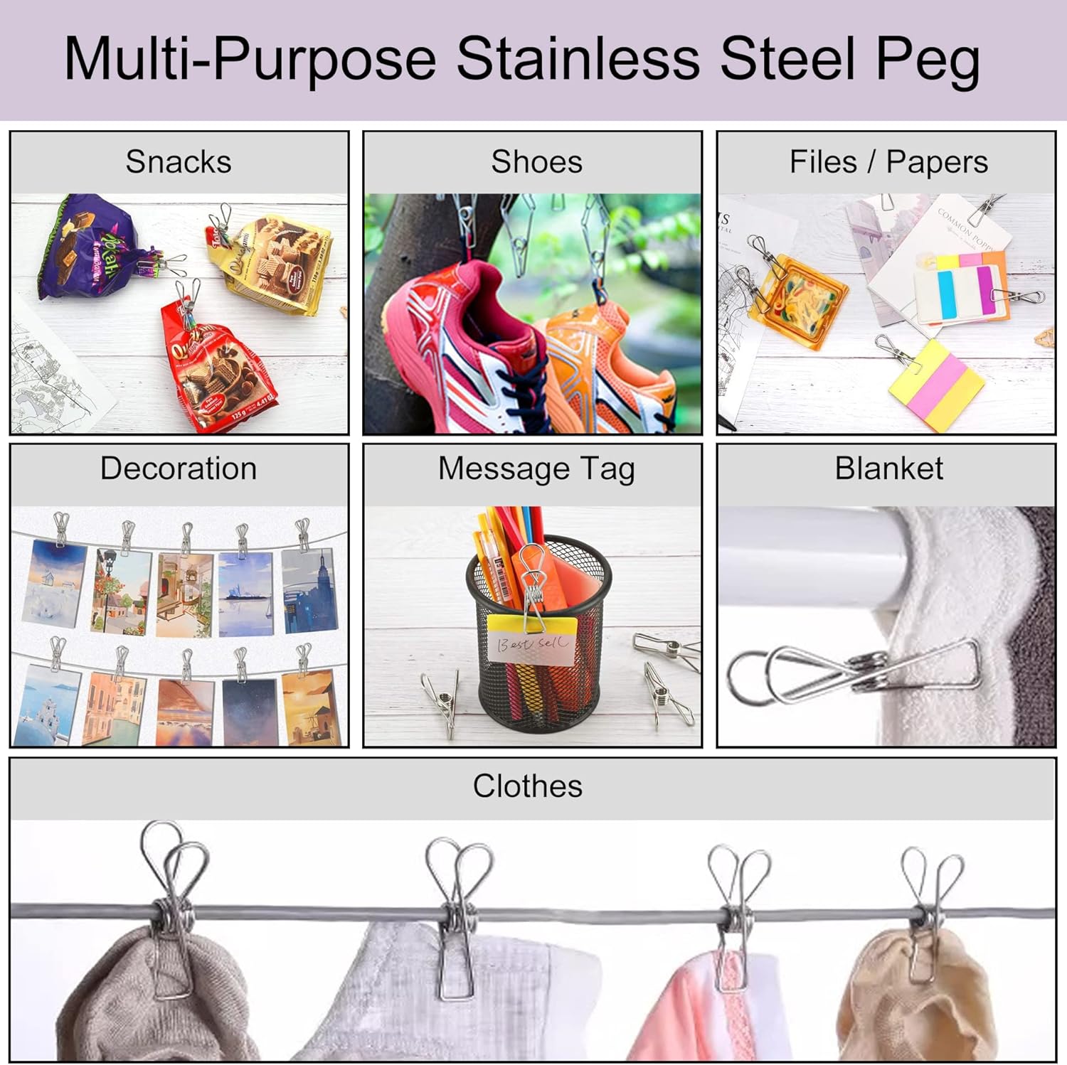 - Multiple Purpose Home Essentials : Can not be only used as clothes clamps for outdoor clothesline,laundry for hanging and drying clothing,blankets,linens,socks,bras,underwear,towels,scarves,hats etc.,it also can be widely used for snack bag sealing,food freezer storage clip,room decoration,picture hanger, paper files clips,home,kitchen,bathroom,office,decor and even travel.