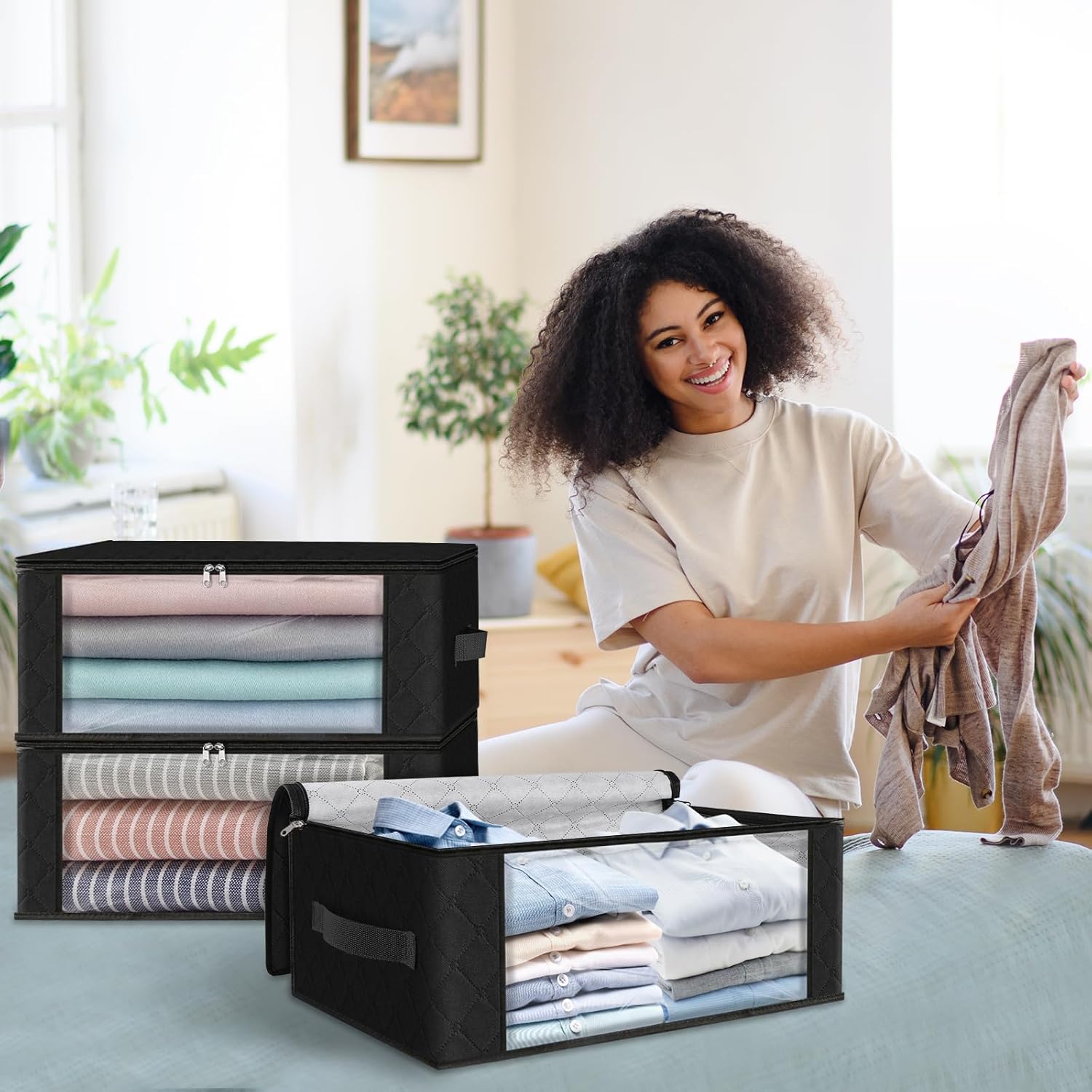 HomeHacks 6-Pack Clothes Organizer Storage Bags Foldable Storage Box with Large Clear Window Sturdy Handles for Closet, Dorm, Pillows, Bedding, Clothes, Stuffed Toys, Blankets, 35L, Black